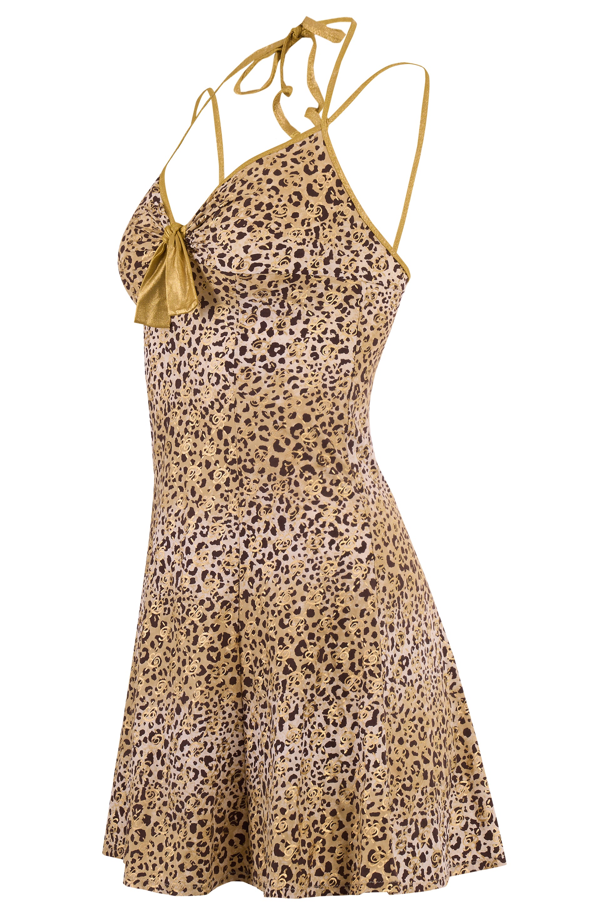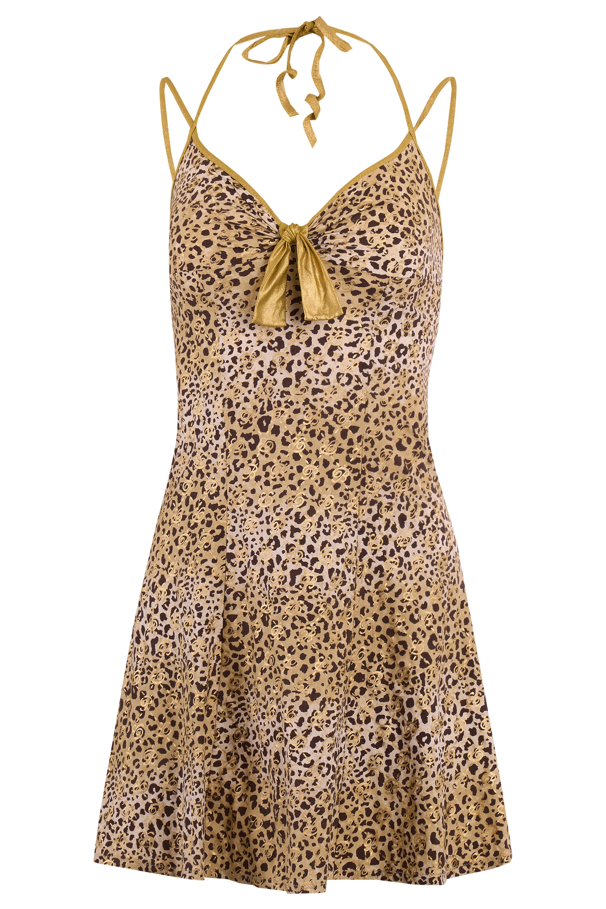 Blumarine leopard print halter dress. Features a brown, beige and gold tone leopard print all over A line silhouette, halter neck ties and thin spaghetti straps, gold bow details at the front a plunge neckline. In excellent vintage condition.