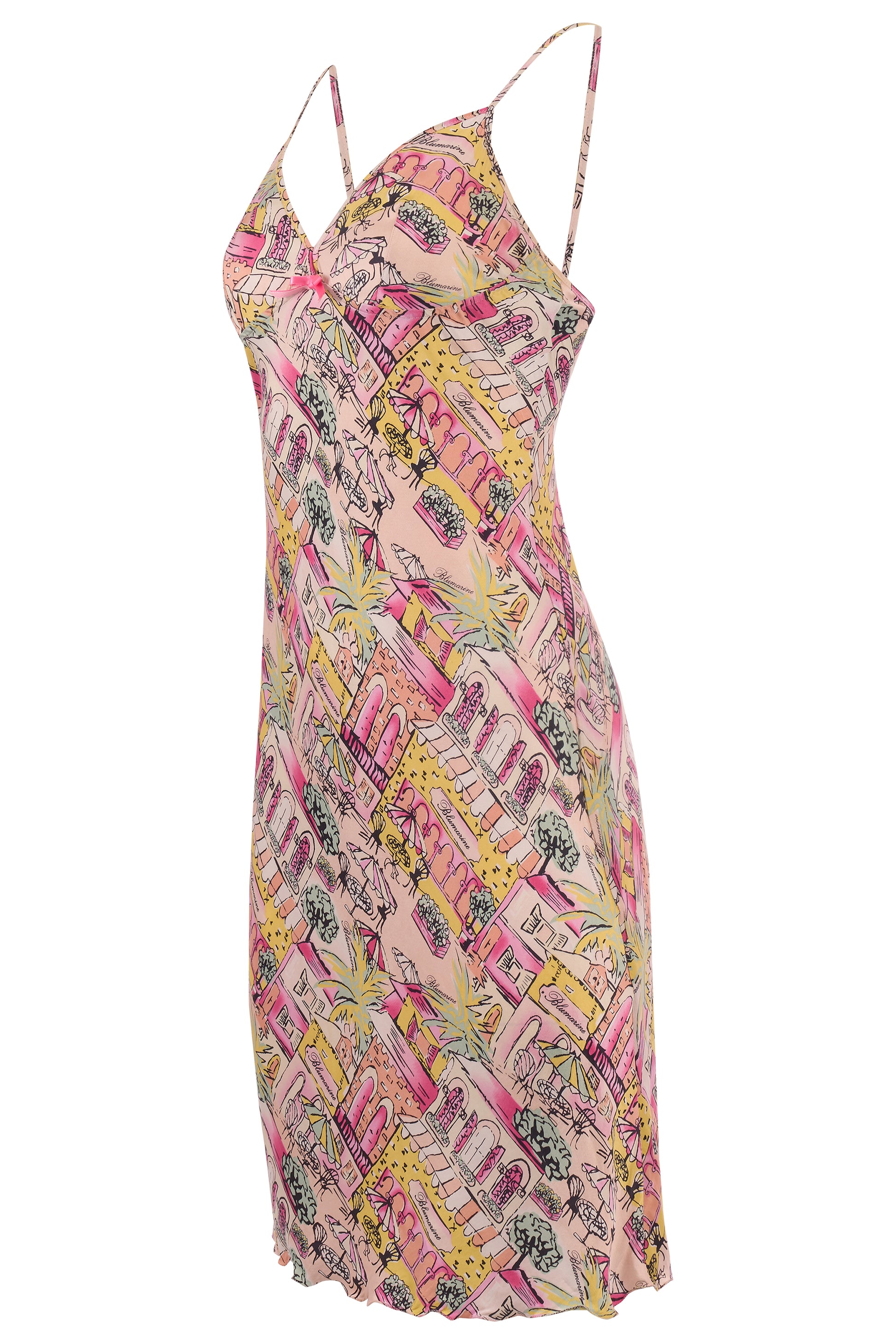 Vintage Blumarine pink silk dress. Features skinny straps, plunge neckline, pink bow ribbon, summer city print all over . In excellent vintage condition.