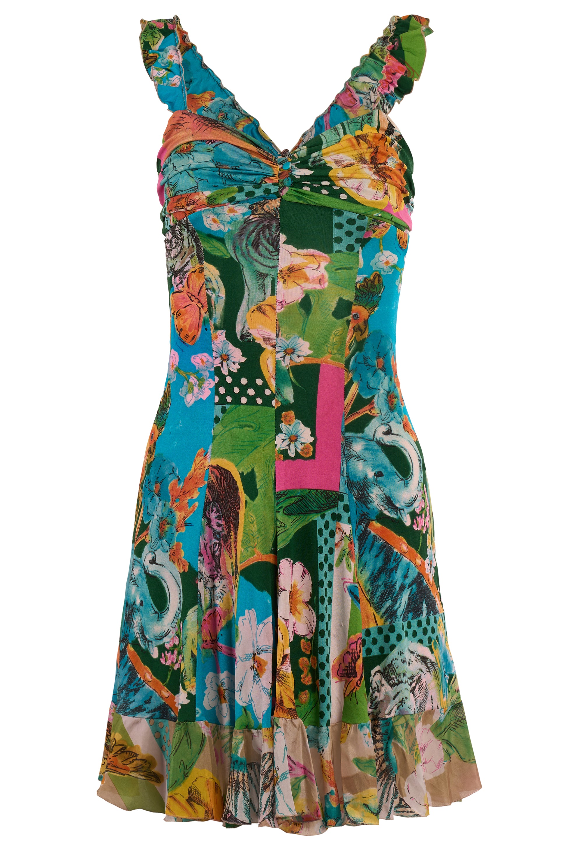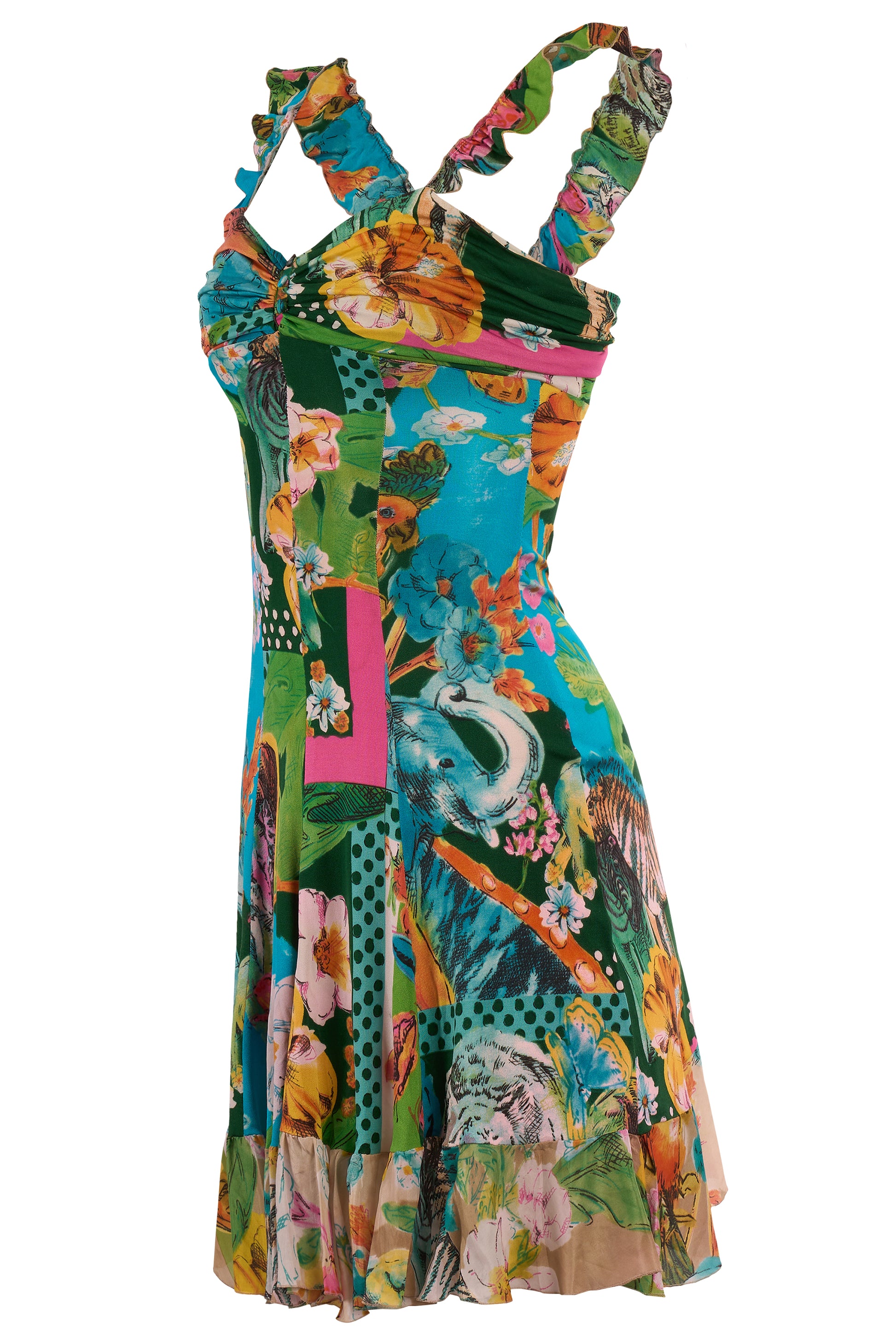 Vintage Blumarine tropical patchwork dress . Features a vivid patchwork design with exotic floral prints, wildlife imagery. The v neckline is softly ruched and finished with subtle ruffles along the shoulders. Ruffles silk hem and along the back . Fastens with three front buttons. In excellent vintage condition.