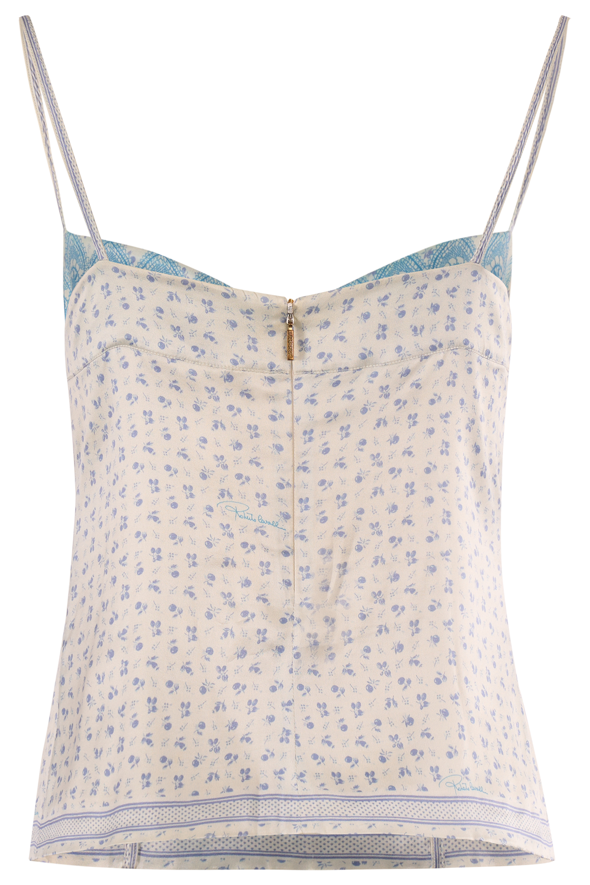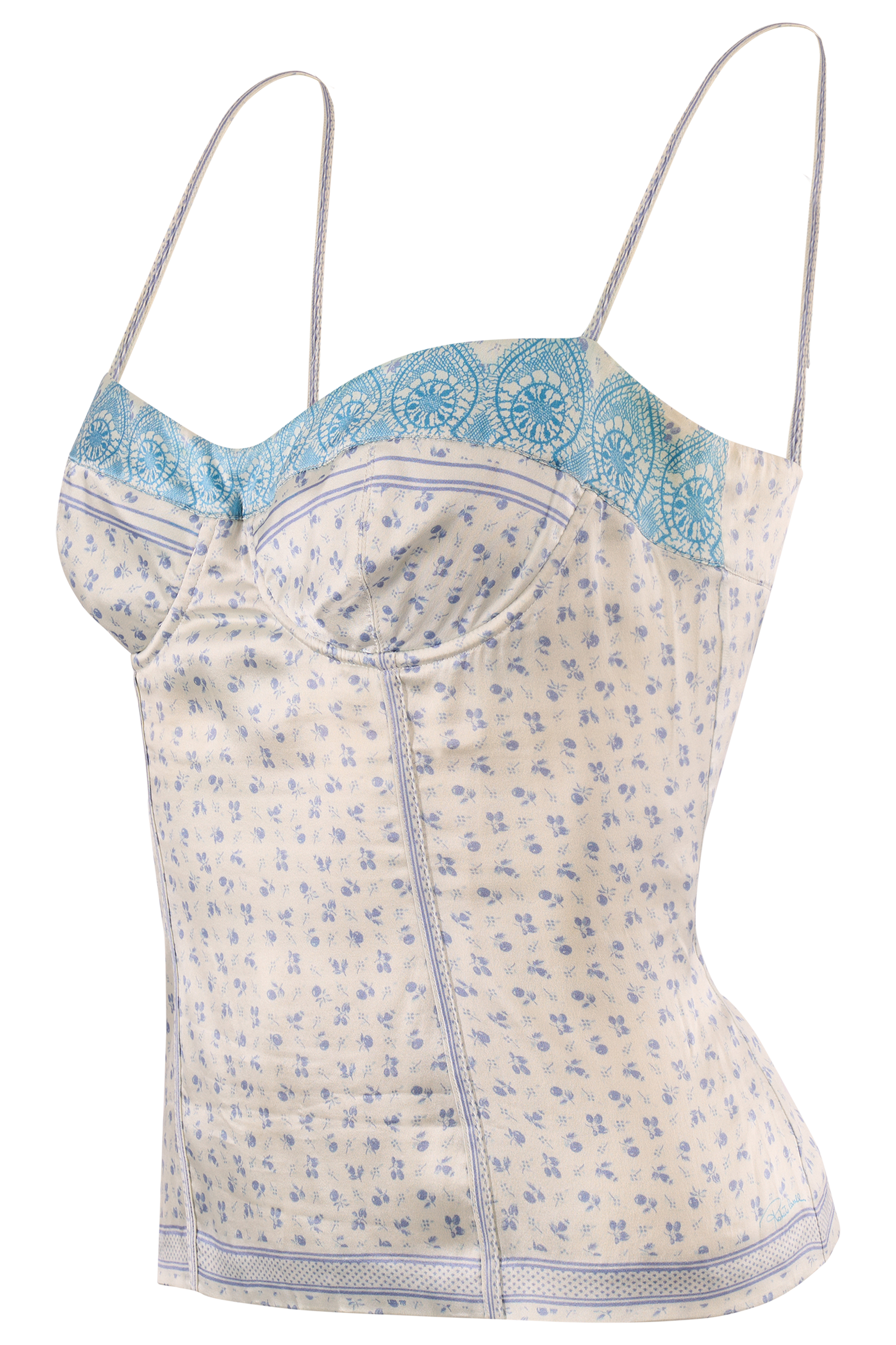 This delicate silk camisole by Roberto Cavalli Features a soft ivory base with ditsy blue structured bustier style seaming for a flattering fit and a scalloped turquoise lace trim. Spaghetti straps. Fastens with a concealed back zip. In excellent vintage condition.