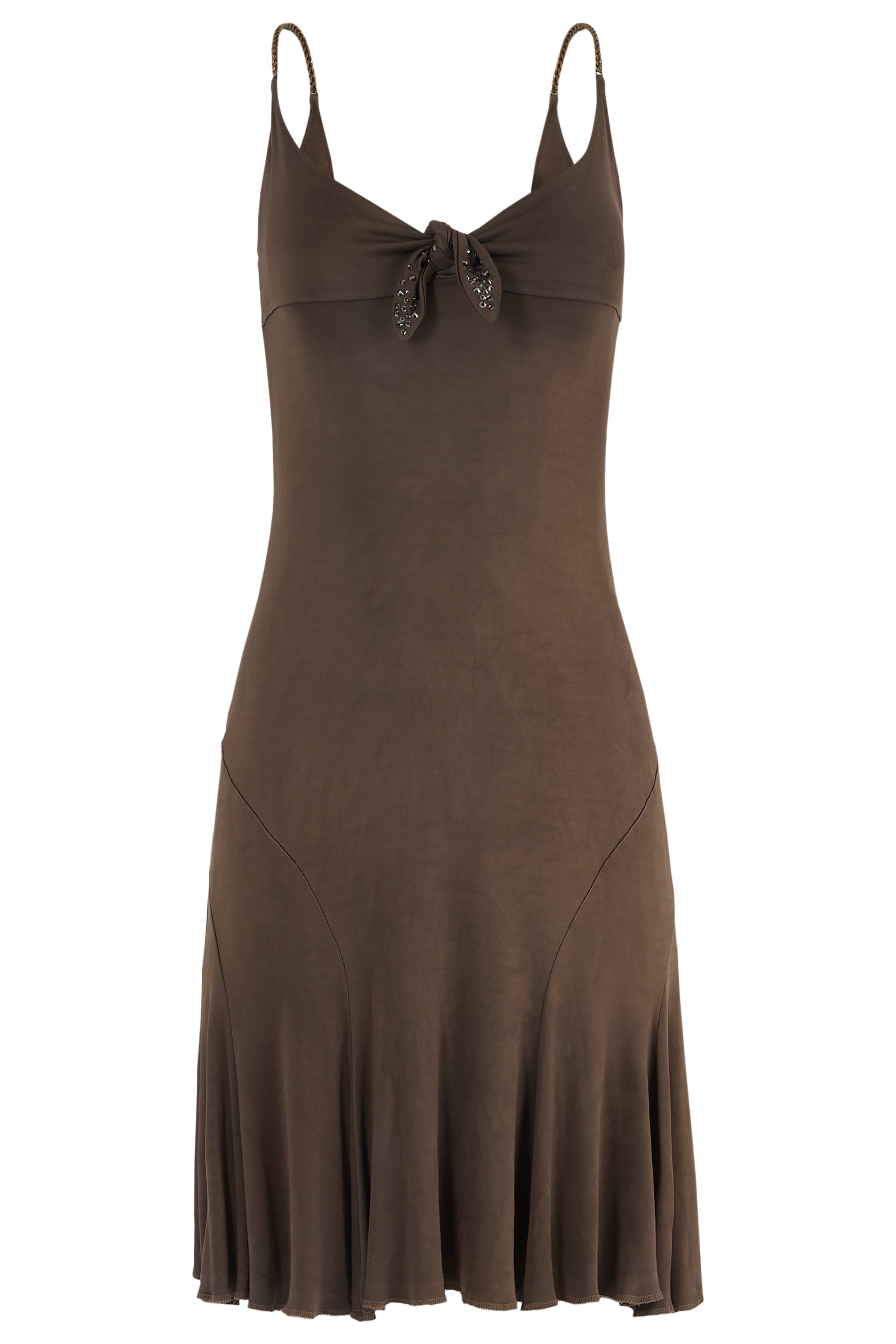 Vintage Brown Bow Dress By Blumarine. This is an early 2000's Summer Dress. This dress features a gold chain straps. As well as a studded glitter bow tie element on the front of the bust, which can be tied or left untied. The fabric has a stretch which enables different curves to fit this piece. Panels are long the bottom of the dress to add a floaty figure. In Excellent Vintage Condition