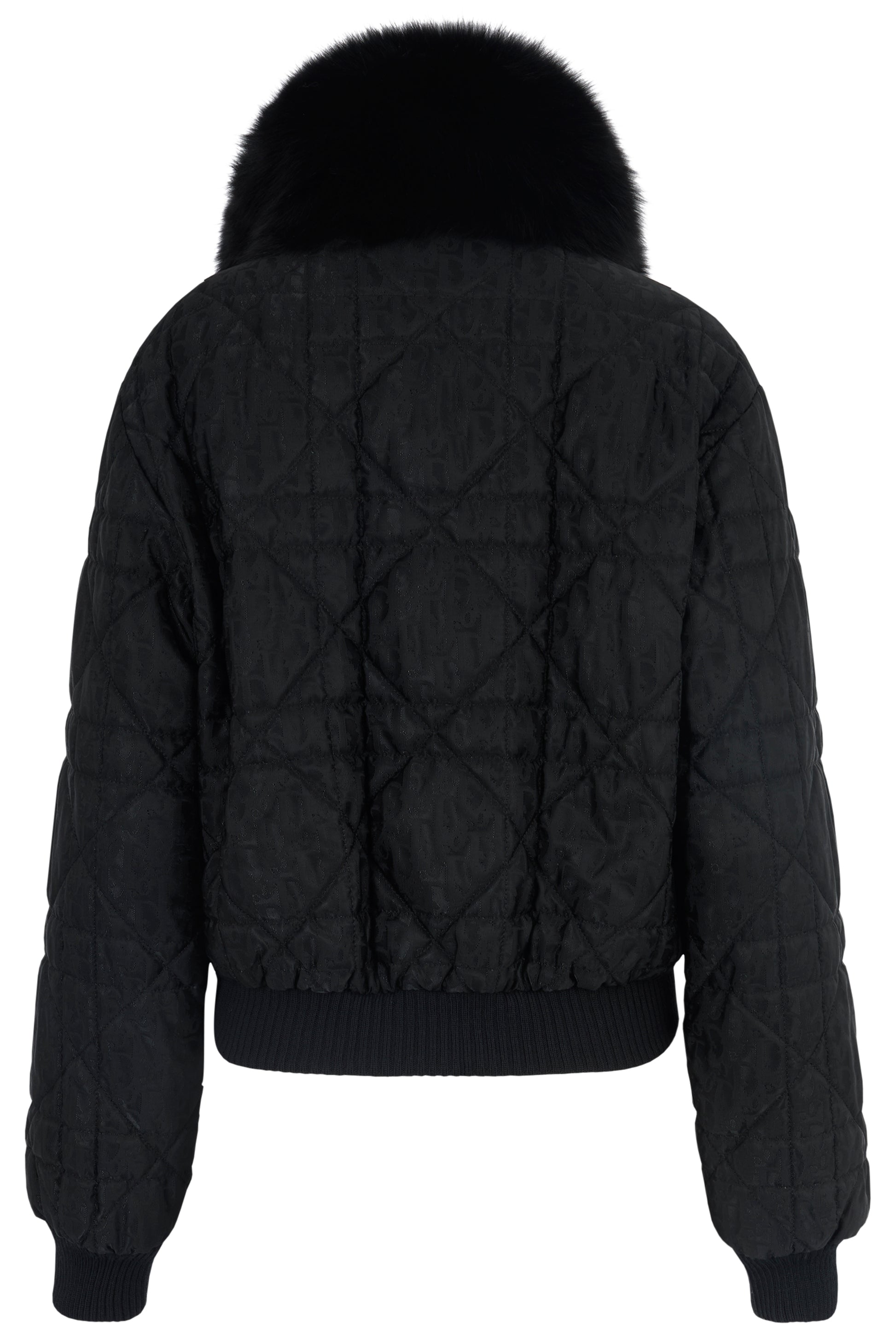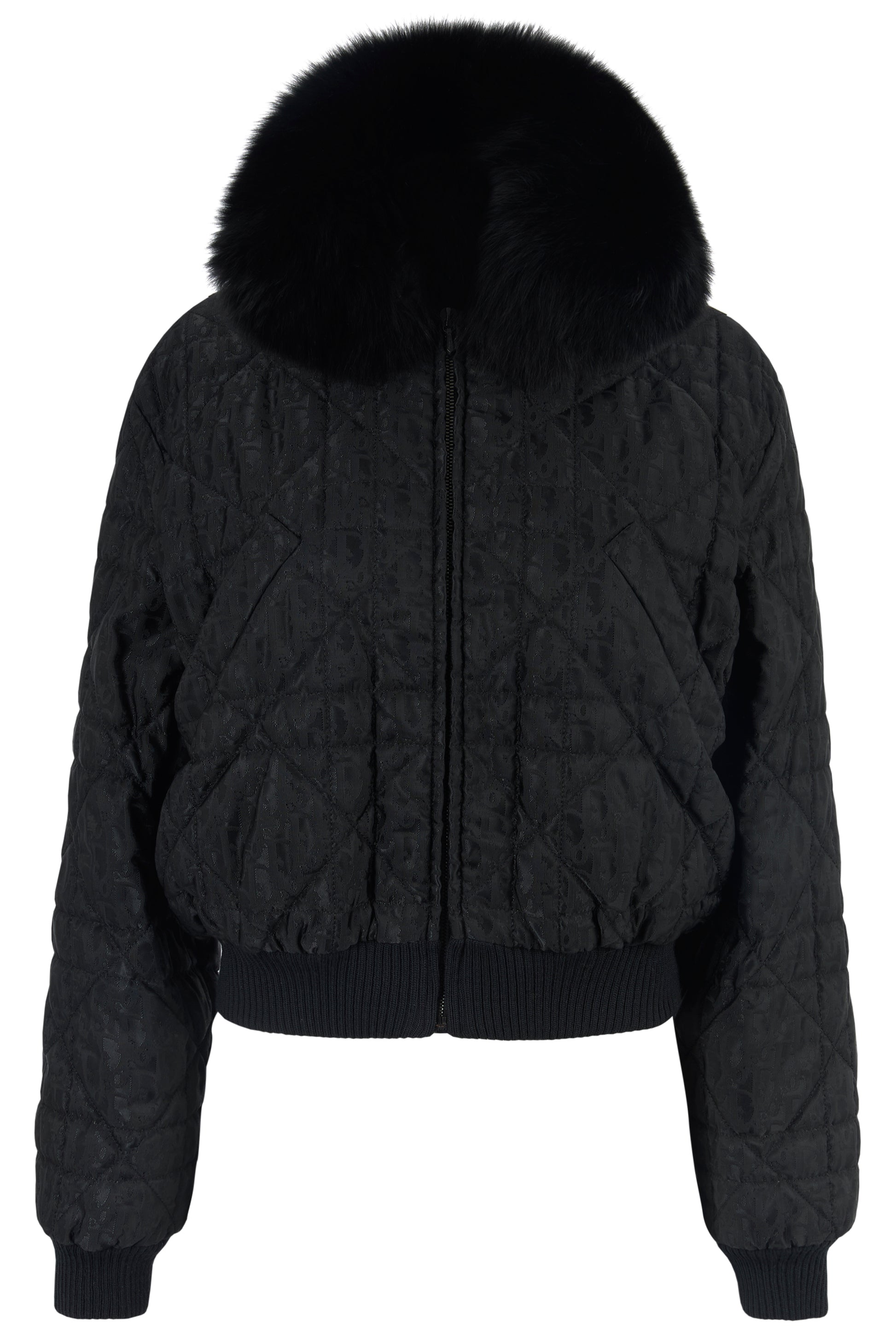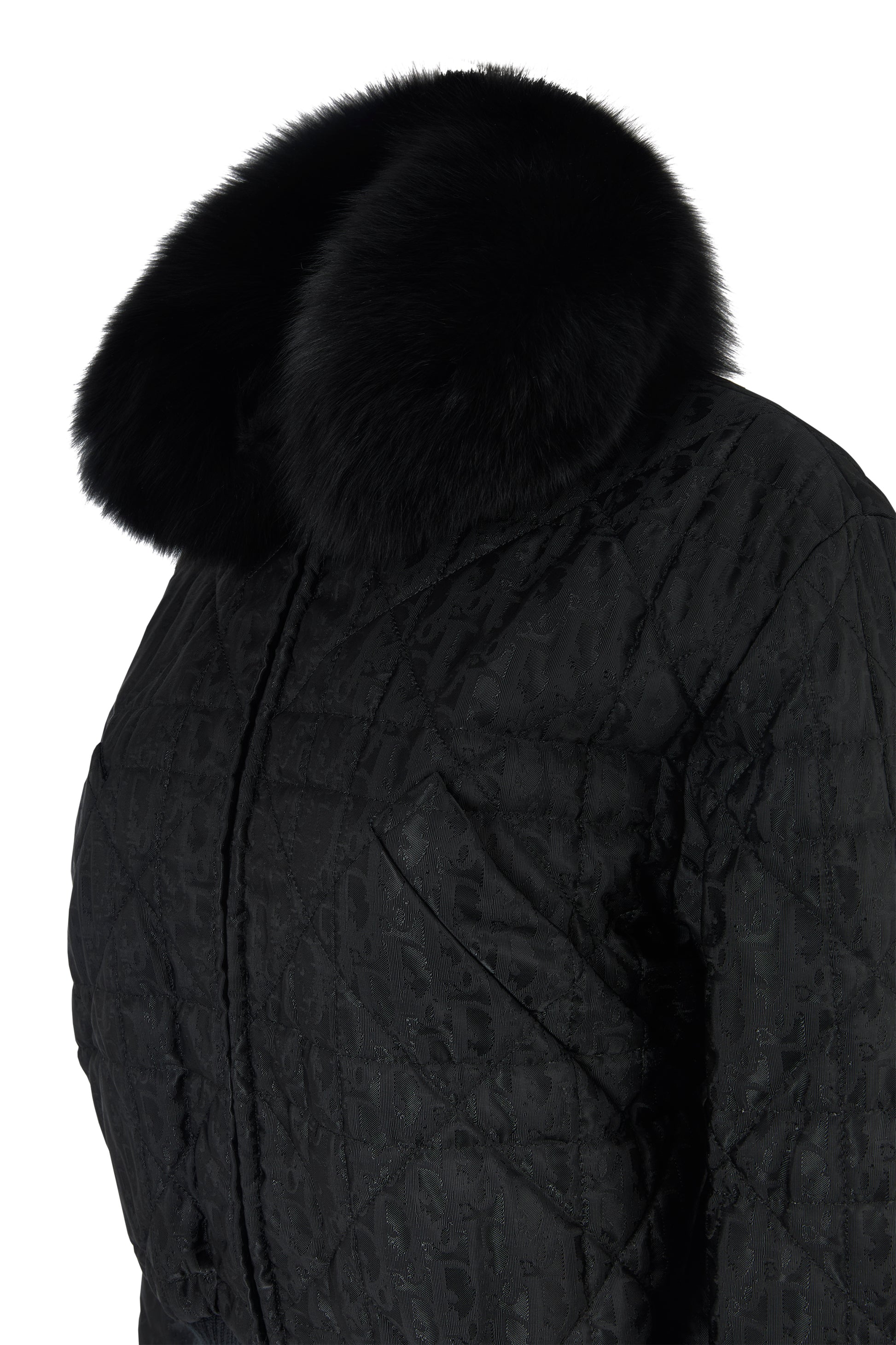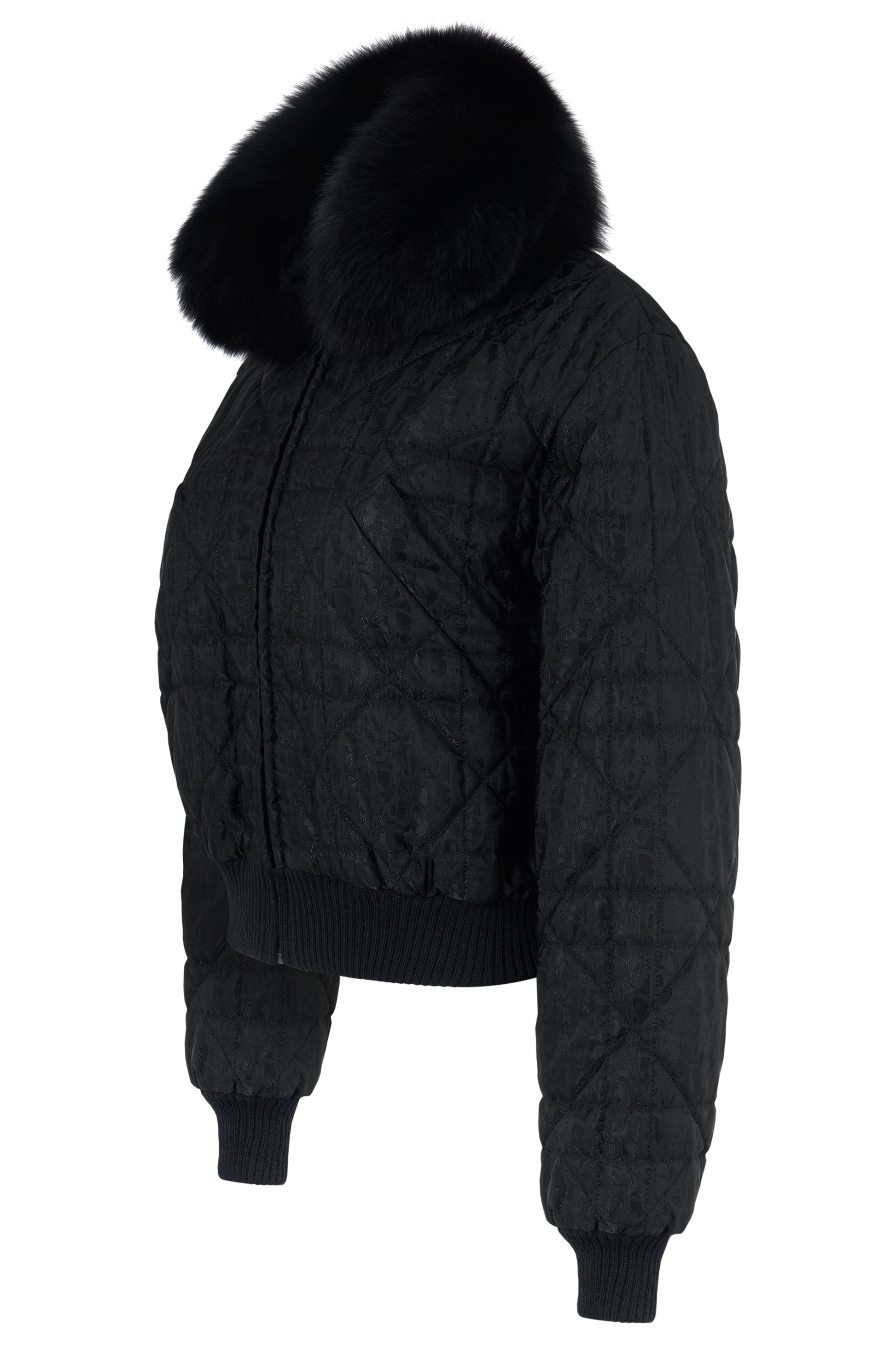 Vintage Christian Dior by John Galliano Fall Winter 1998 Bomber Jacket . Features a black quilted fabric with the classic " Dior" monogram print all over, black fur trim collar, two front pockets, cropped cut and ribbed cuffs and hem. Fastens with a front zip closure.