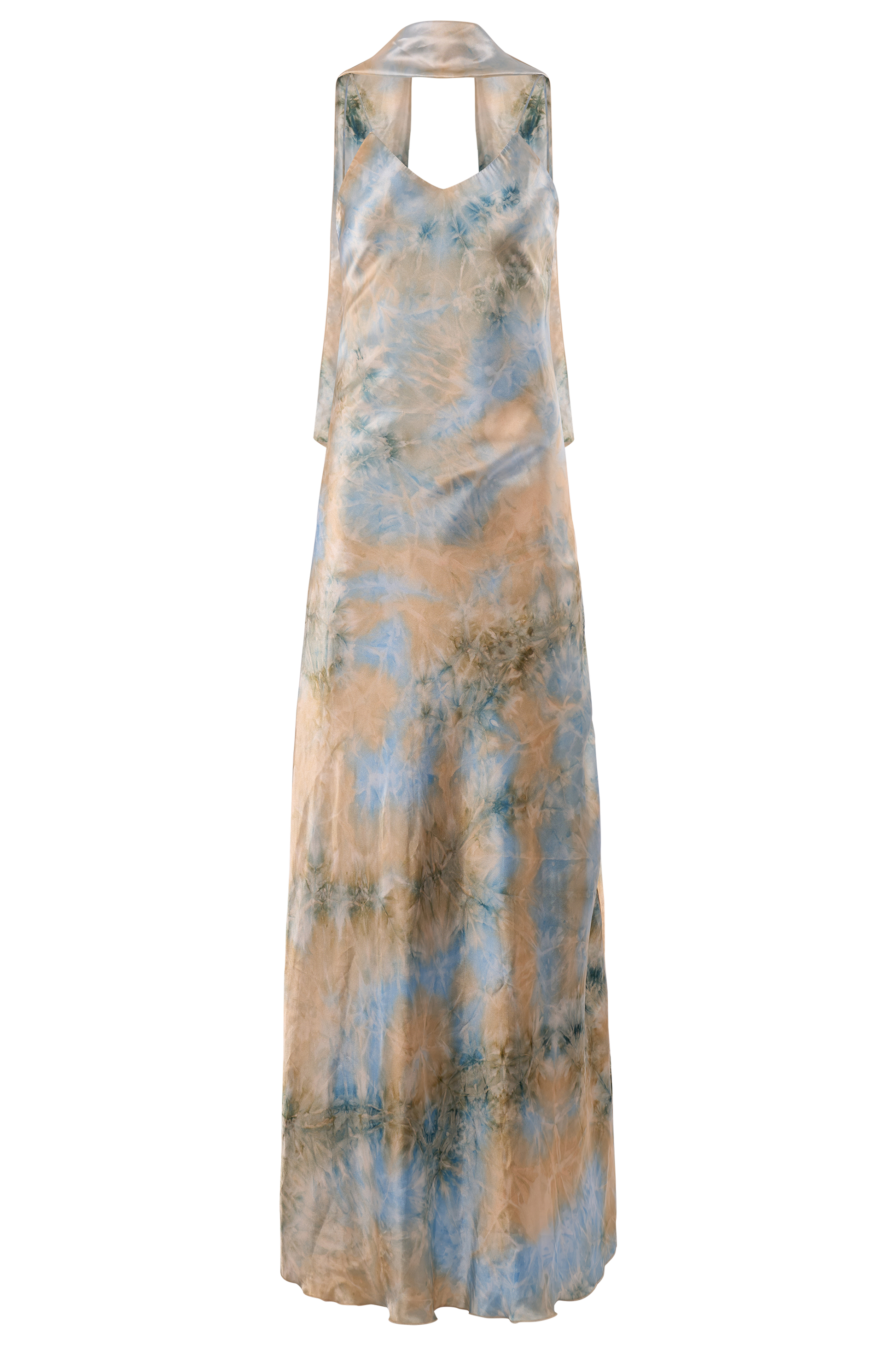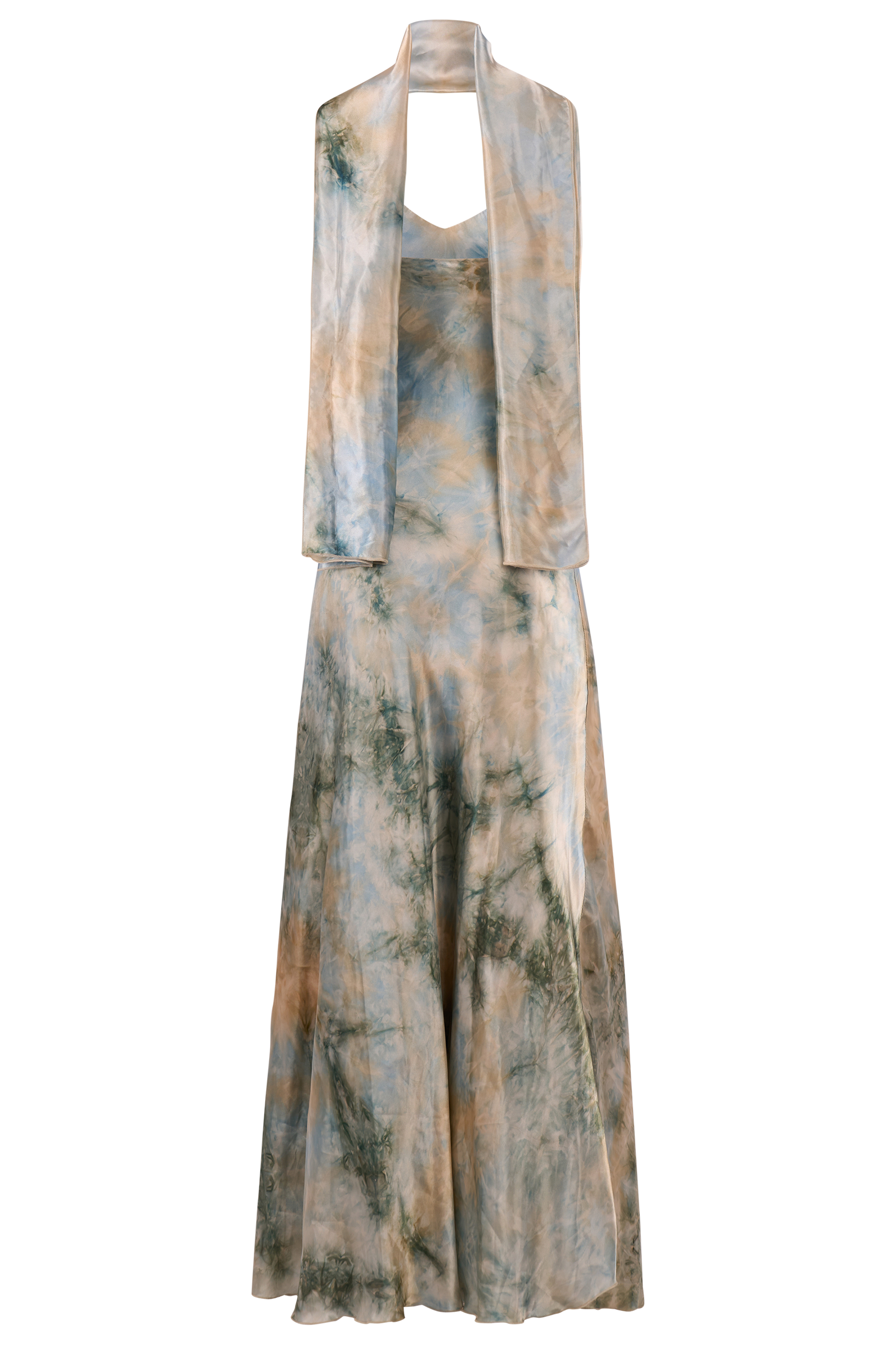 Vintage 2000's Yves Calin tie dye maxi dress with matching scarf. This flowing maxi dress features a painterly tie-dye print in soft hues of sky blue, sand beige, and sage green, Cut on the bias for a flattering, fluid drape, the dress skims the body with a delicate V-neckline and low-cut back. Paired with a matching scarf . In excellent vintage condition.