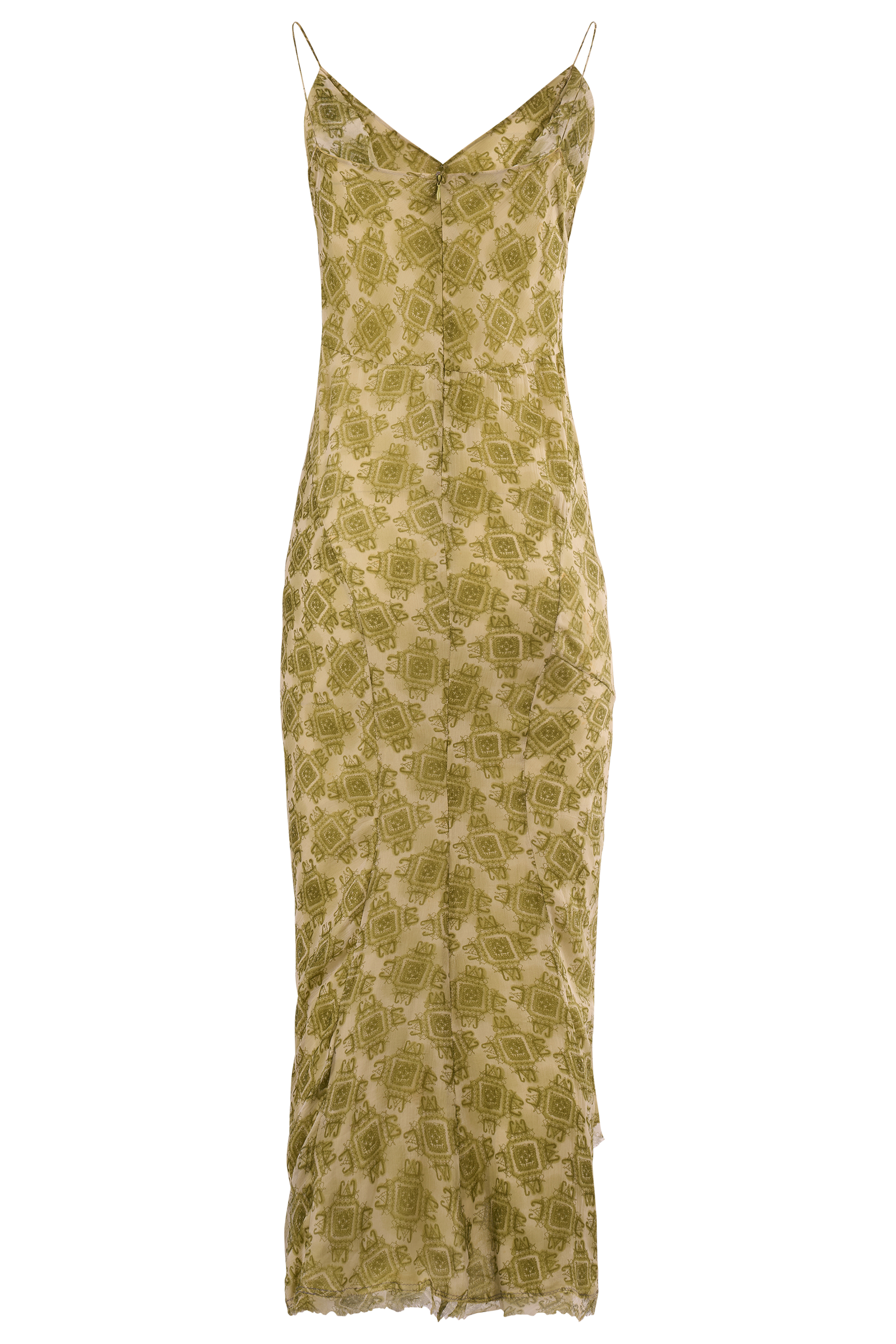 Vintage Ermanno Scervino Green Silk Print Dress. Features a green silk body with geometrical figures. V plunge neckline and draped at the front, skinny spaghetti straps , knotted drape details at the hip, asymmetrical hemline. Fastens with a concealed back zip. In excellent vintage condition,