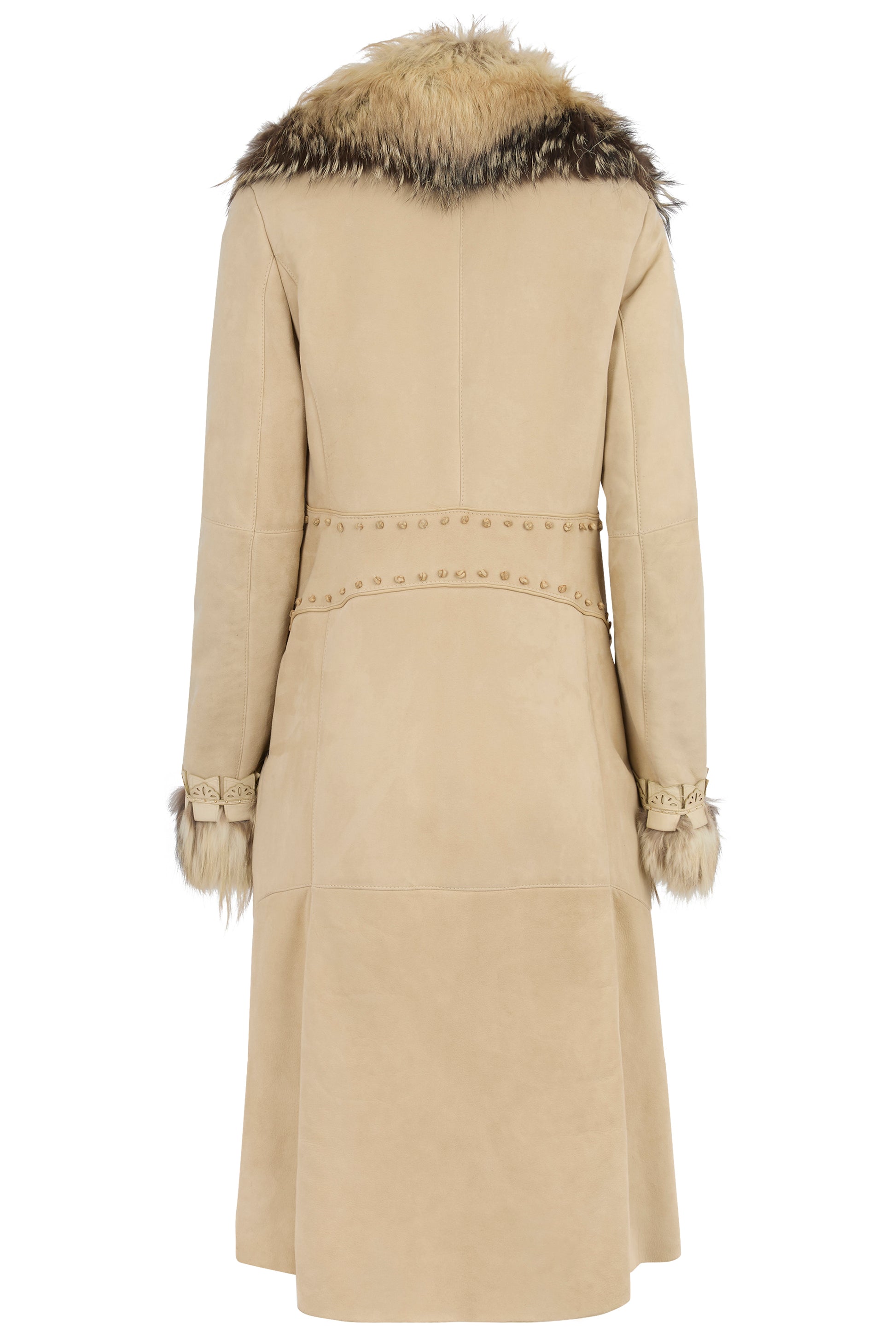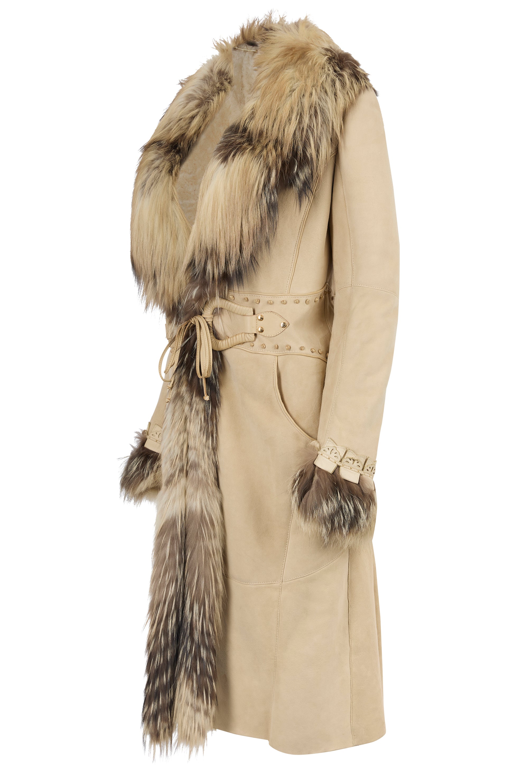 Vintage F/W 2006 Roberto Cavalli leather suede and silver fox trim coat. Features a light beige suede fabric body. Oversized collar fur trim to the hem and cuffs. Lace up waist cinching with leather ties, leather studded accent at the waist and cuffs. Fastens with hidden hooks and front ties .