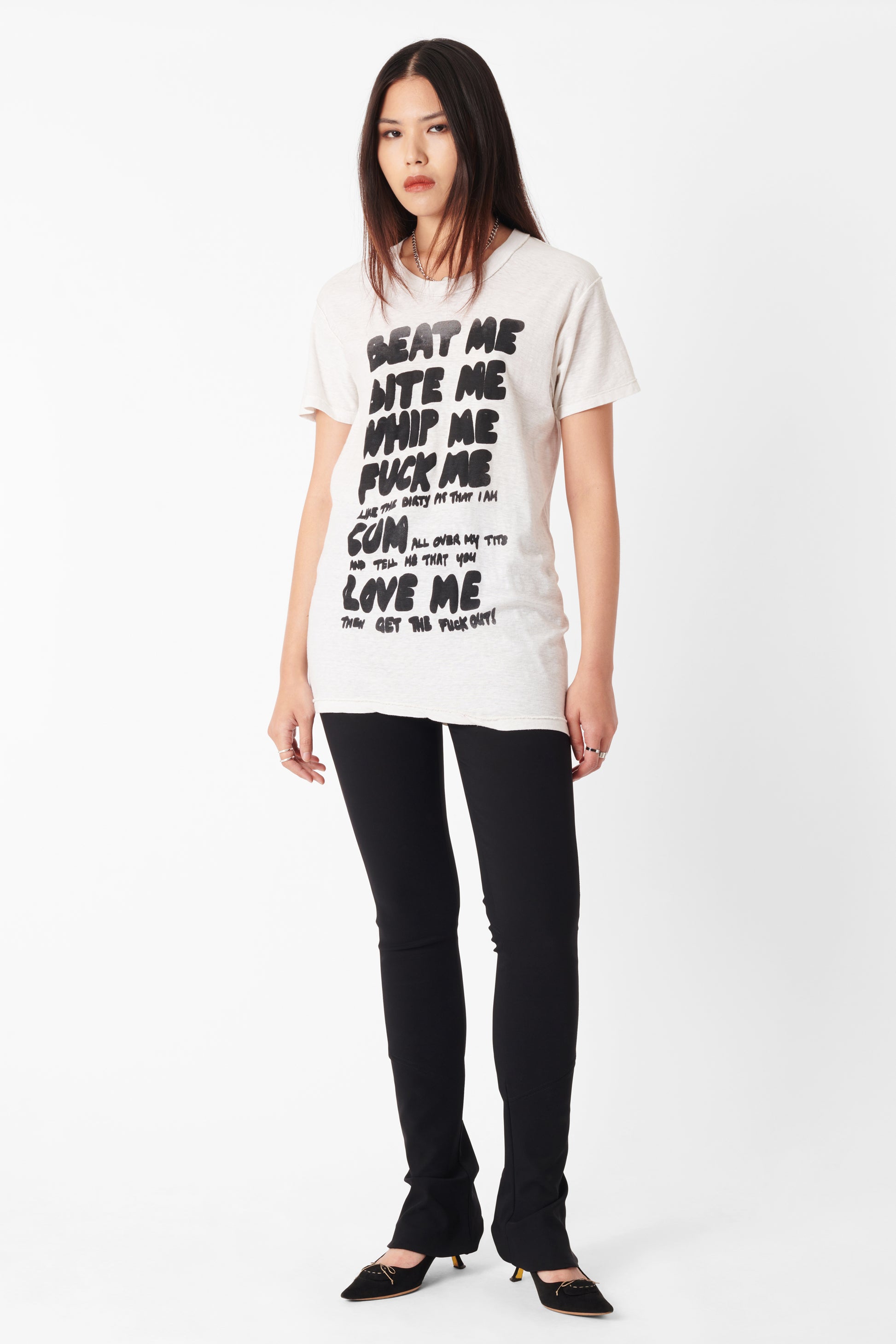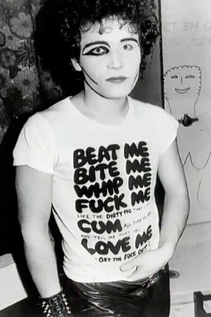 Vintage late 1970’s Vivienne Westwood x Malcolm Mclaren Seditionaries ‘Beat Me Bite Me’ t-shirt top. Features print reading; ‘Beat Me, Bite Me, Whip Me, Fuck Me, Like the dirty pig that I am, Cum all over my tits and tell me that you, Love Me, then get the fuck out!’. In great vintage condition, natural thread pulling and wear in with Seditionaries designs.