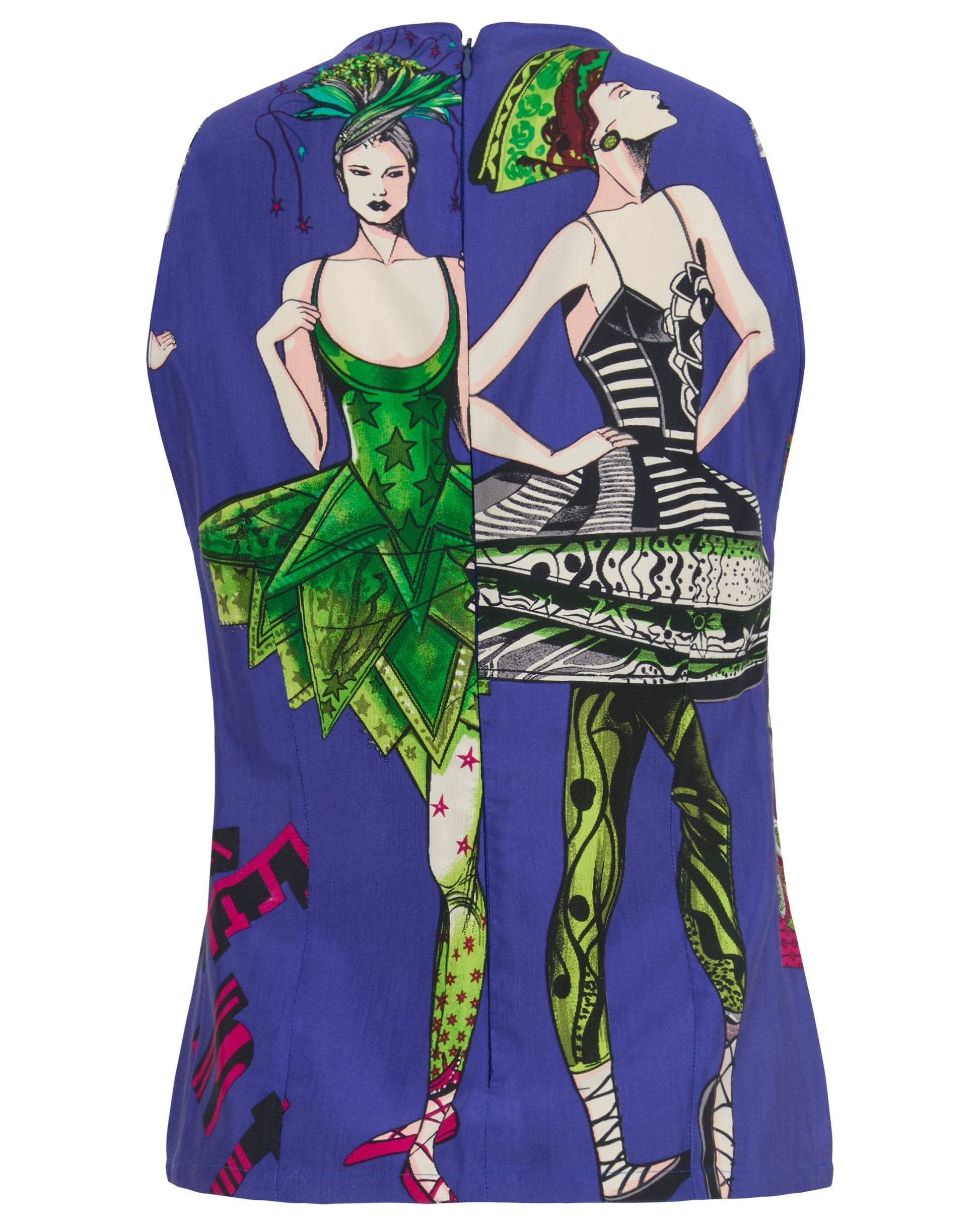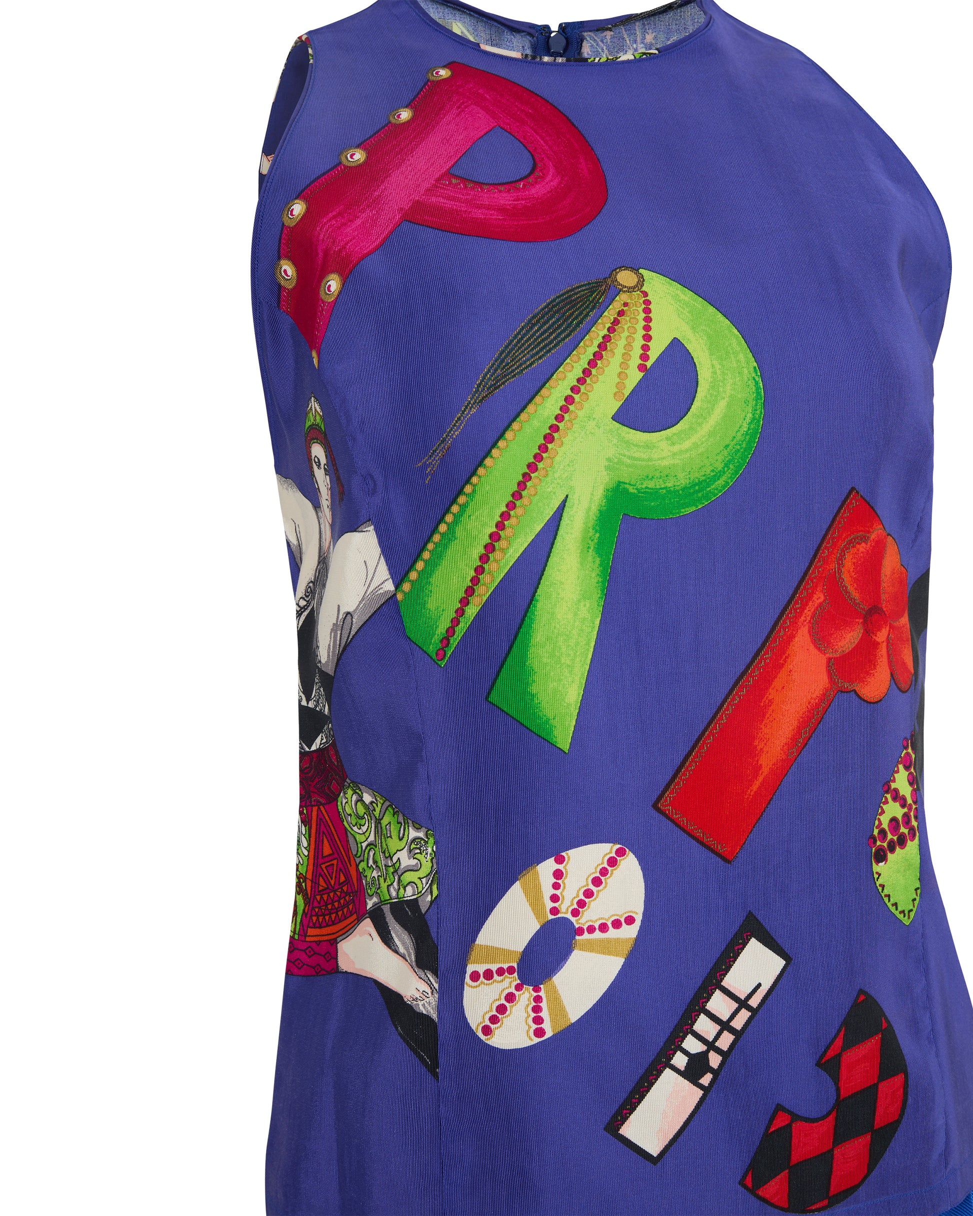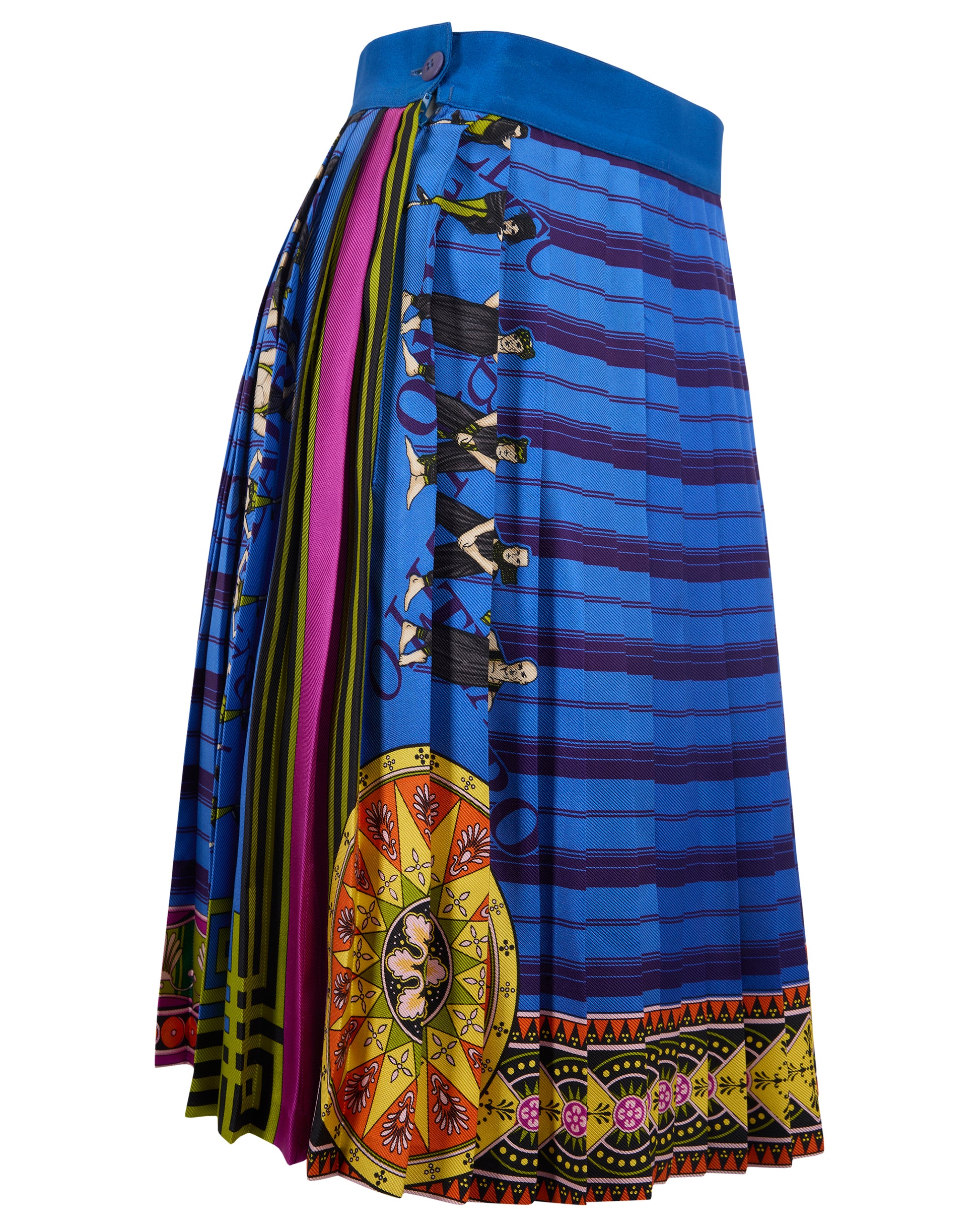This iconic co-ord, shown on the Milan runway, embodies the Pop Art–inspired aesthetic that defined Versace’s Spring/Summer 1991 collection — a bold fusion of contemporary culture and high fashion. The design captures Gianni Versace’s revolutionary style: vivid prints, confident silhouettes, and luxurious, body-skimming tailoring. A pivotal piece from one of the most influential moments in the house’s history, it remains an exceptionally collectible icon of early-’90s fashion. This piece was worn by Linda Evangelista in this collection and is look 47 from this season. It features a pleated midi skirt and a fitted top. In Excellent Vintage Condition.