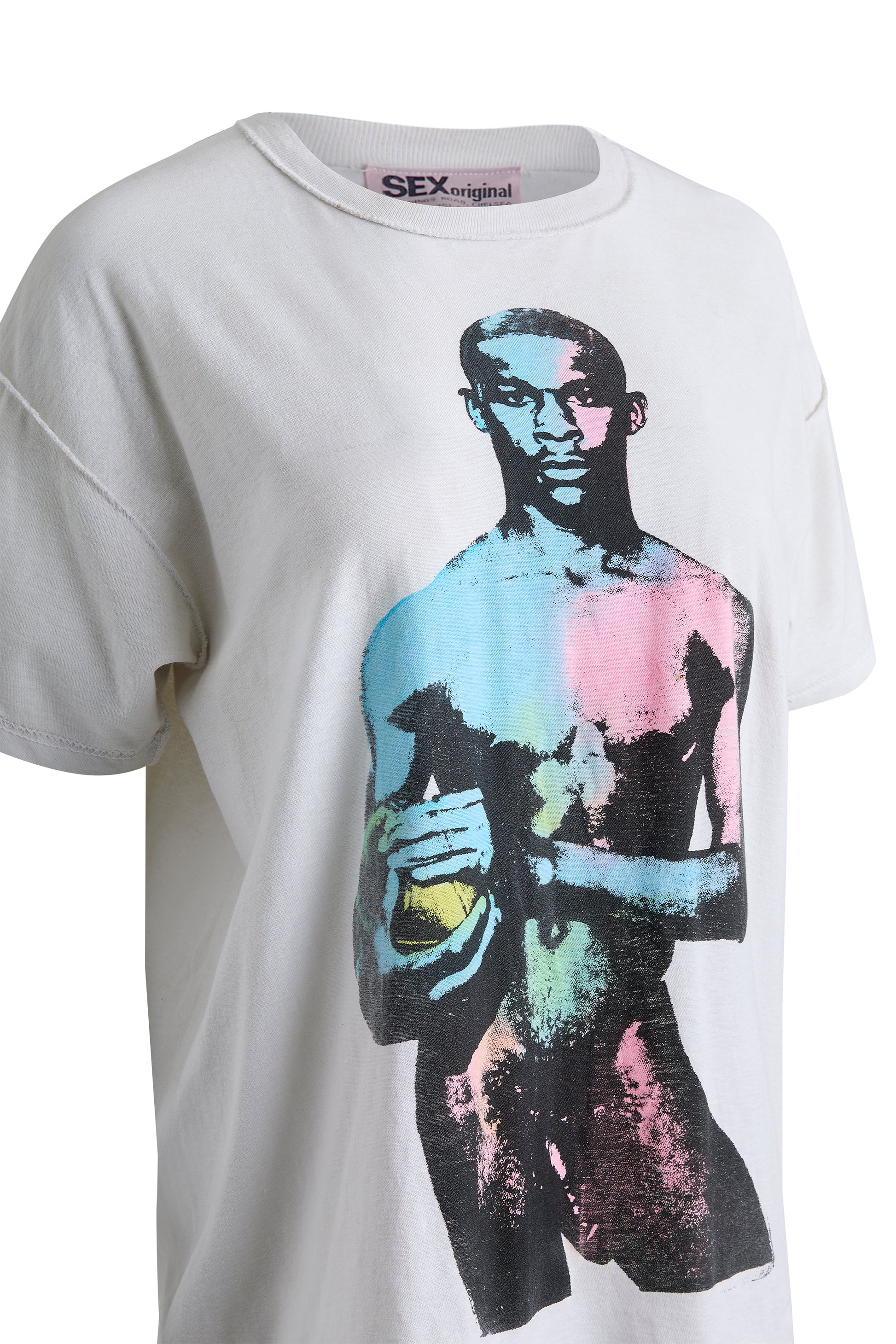 Featuring a bold, confrontational graphic of a nude male figure rendered in vivid, airbrushed tones. Printed on a soft white cotton base with the origina SEX label at the neckline.