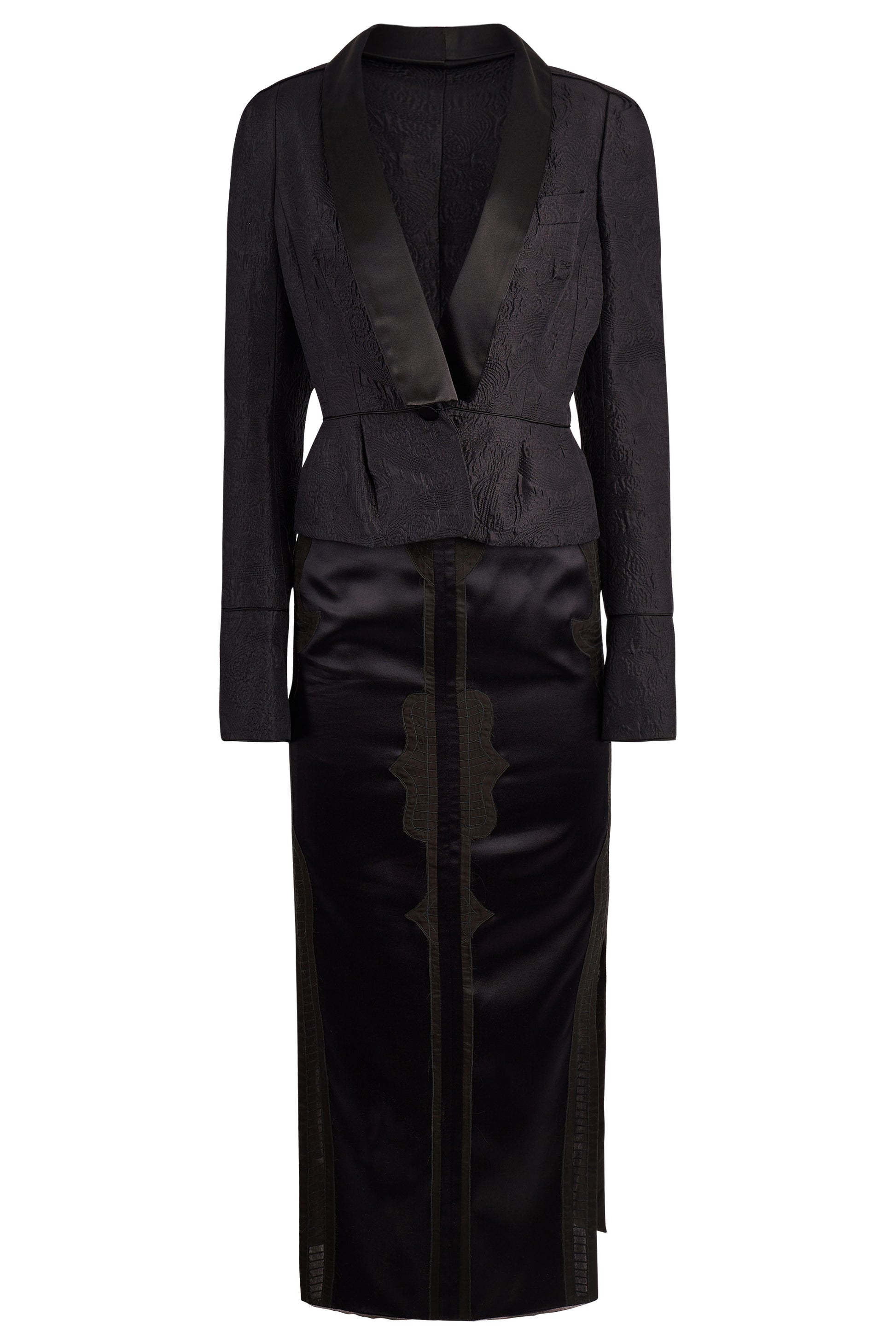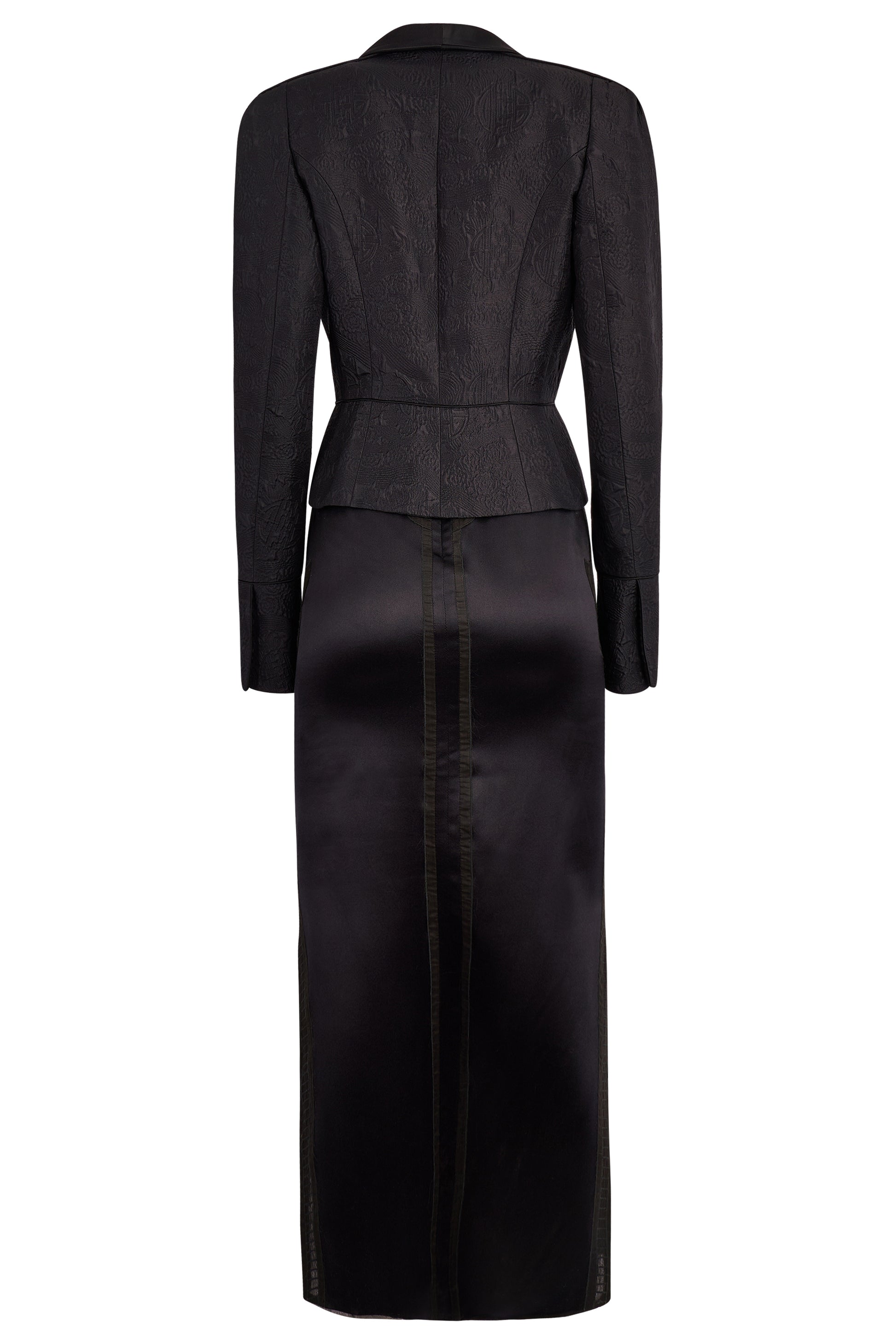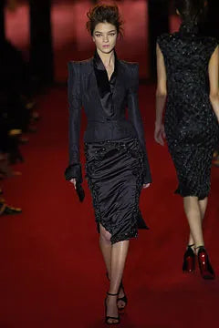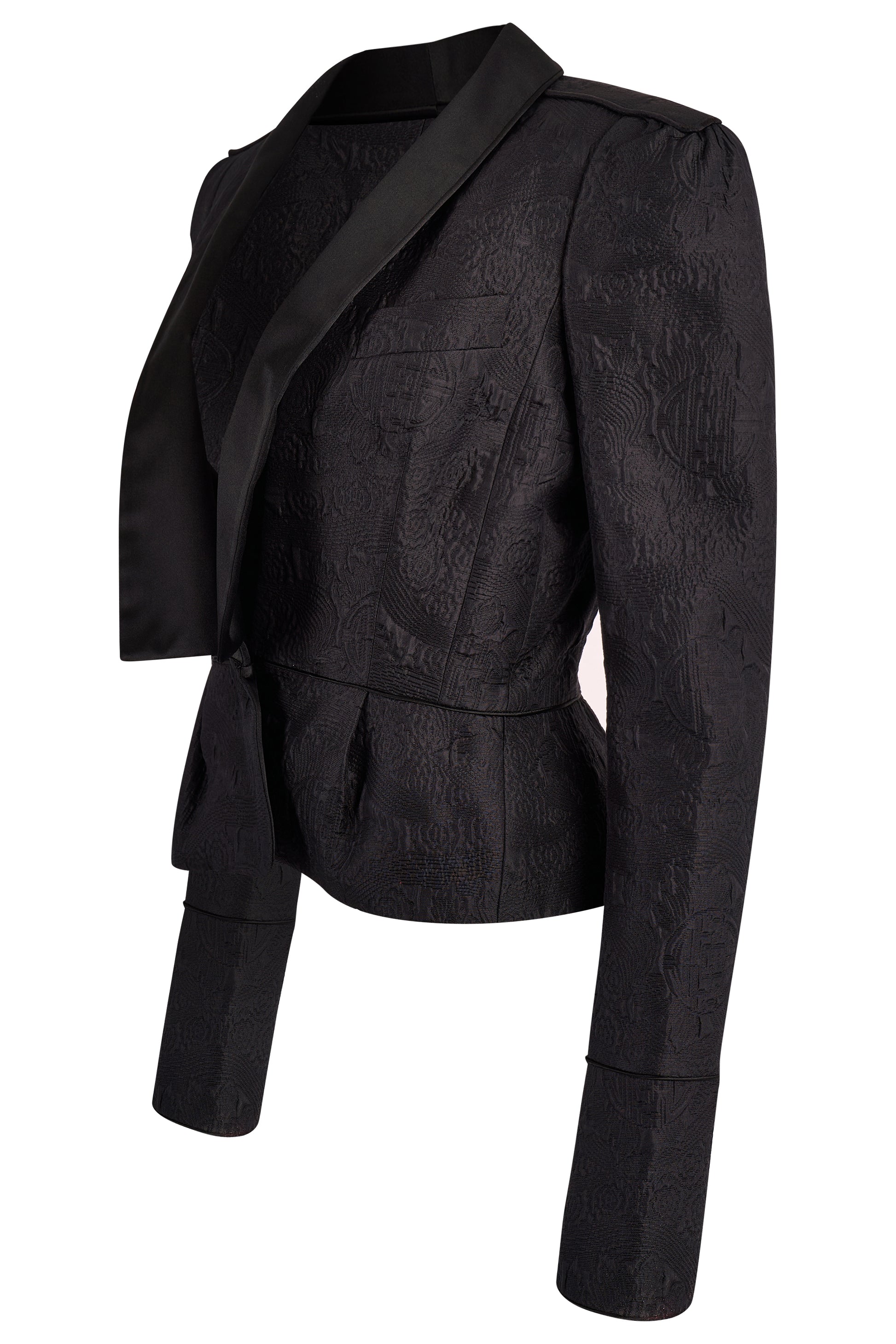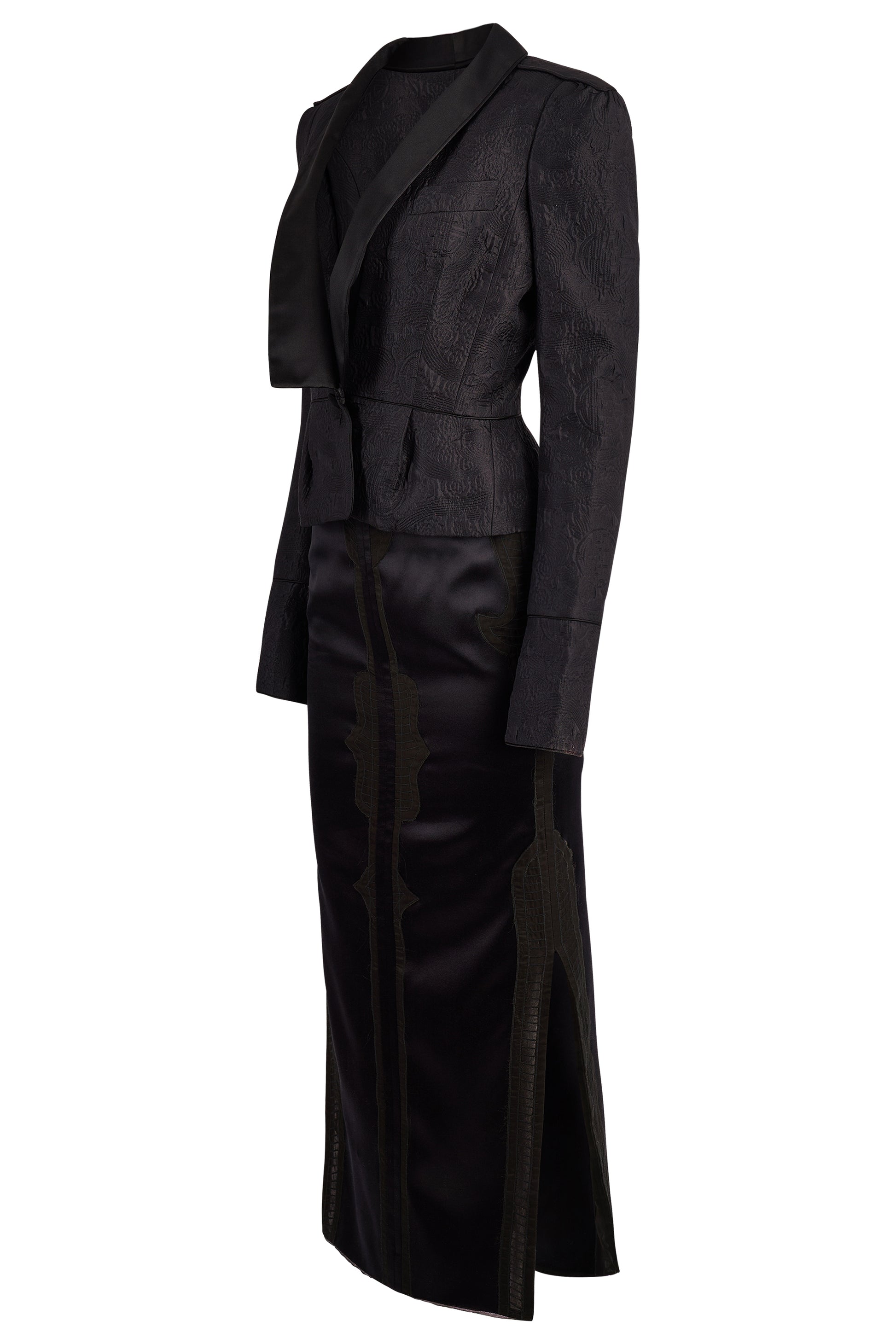Vintage Yves Saint Laurent Rive Gauche by Tom Ford A/W 2004 " Le smoking" from the "Chinoiserie collection" black co ord set runway and campaign. The jacket features a cropped tailored fit with exaggerated shoulder line, satin shawl lapel jacquard pattern and single button closure. The skirt features a high waisted and straight column silhouette, side panel inserts, tonal jacquard matching the jacket, floor length two sleets on each side and fastens with a concealed back zip closure. In excellent vintage condition.