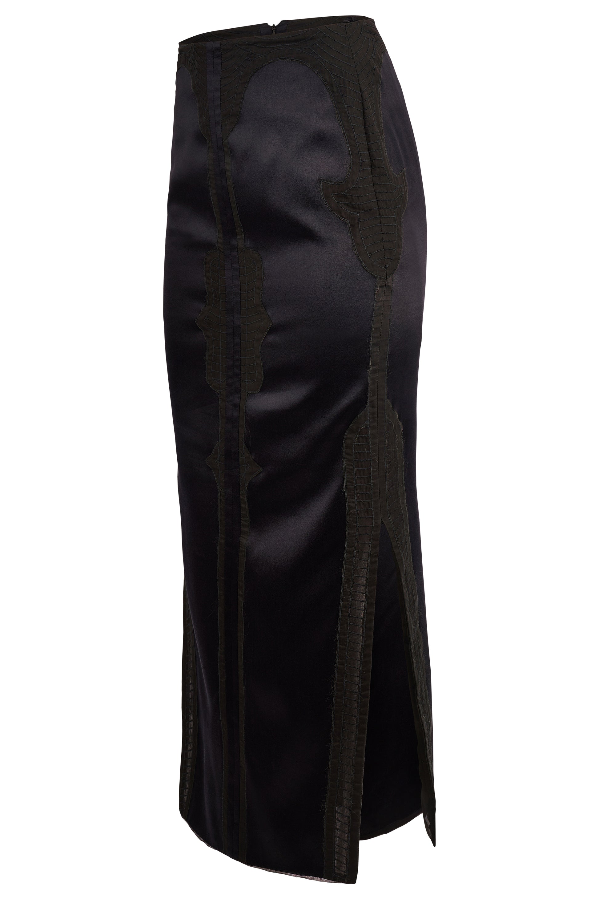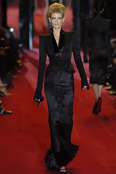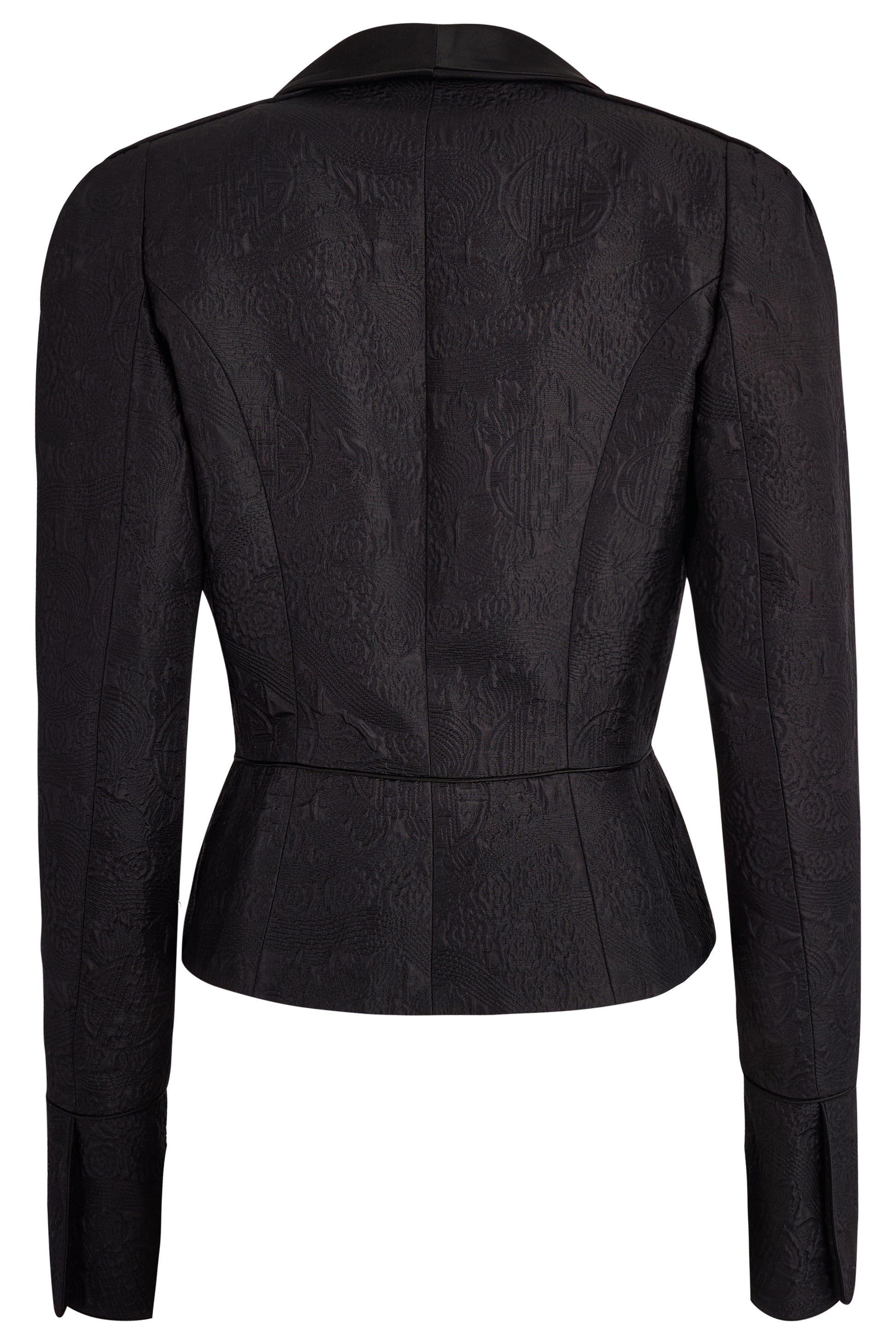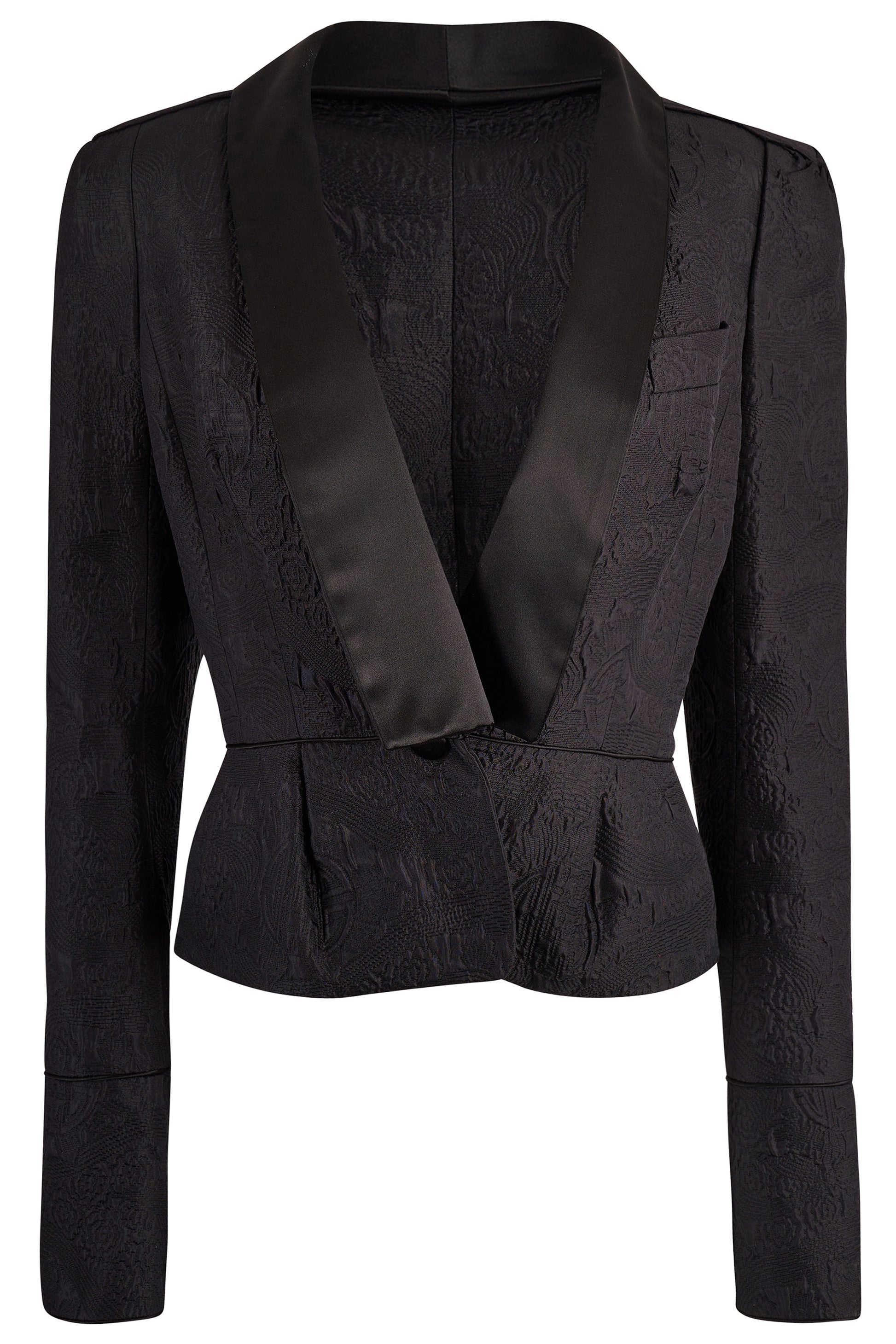 Vintage Yves Saint Laurent Rive Gauche by Tom Ford A/W 2004 " Le smoking" from the "Chinoiserie collection" black co ord set runway and campaign. The jacket features a cropped tailored fit with exaggerated shoulder line, satin shawl lapel jacquard pattern and single button closure. The skirt features a high waisted and straight column silhouette, side panel inserts, tonal jacquard matching the jacket, floor length two sleets on each side and fastens with a concealed back zip closure. In excellent vintage condition.