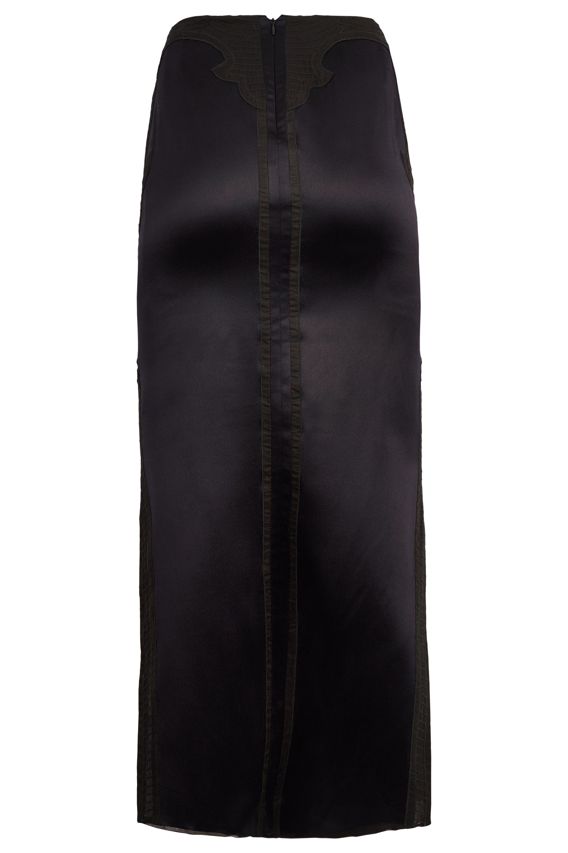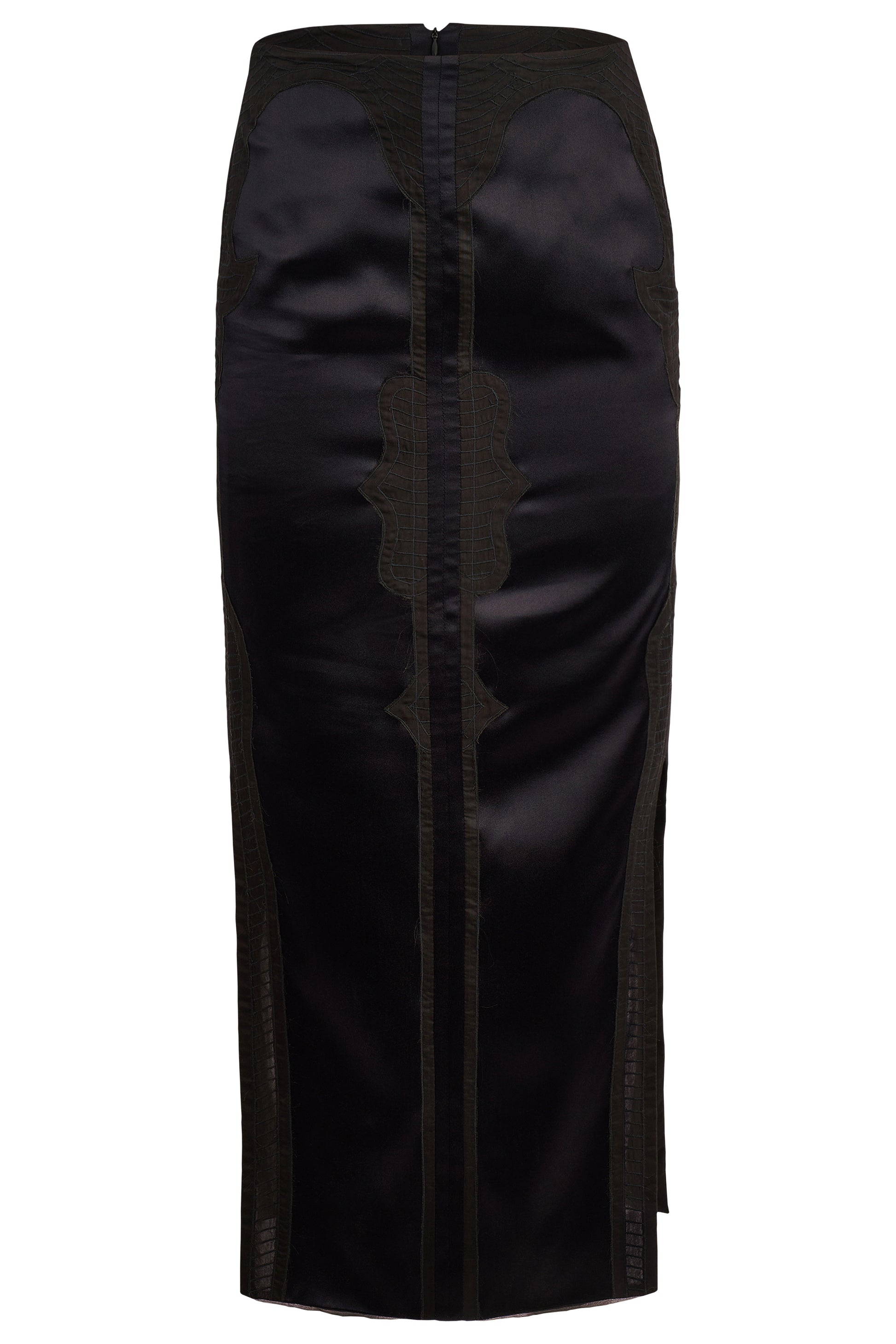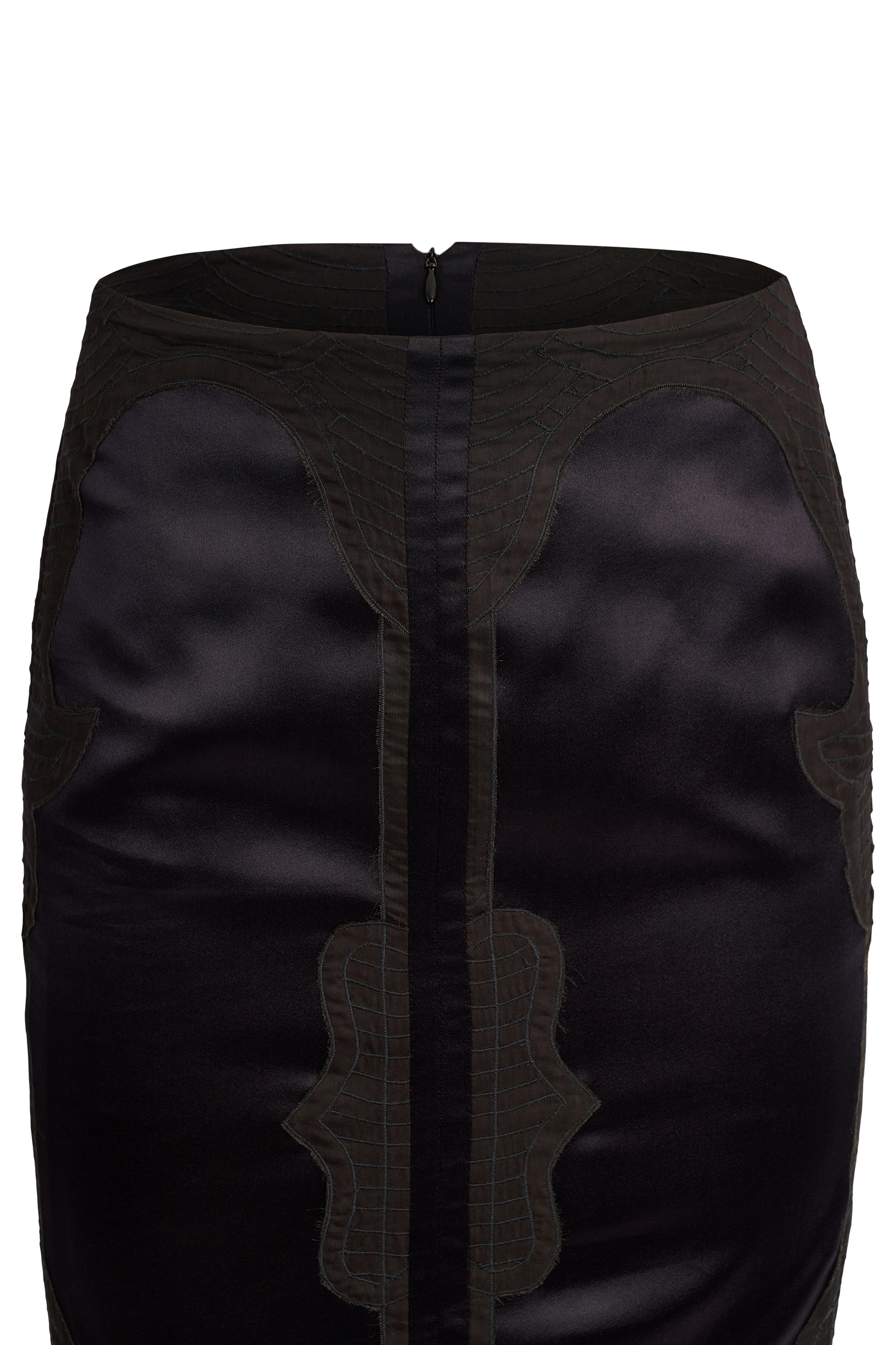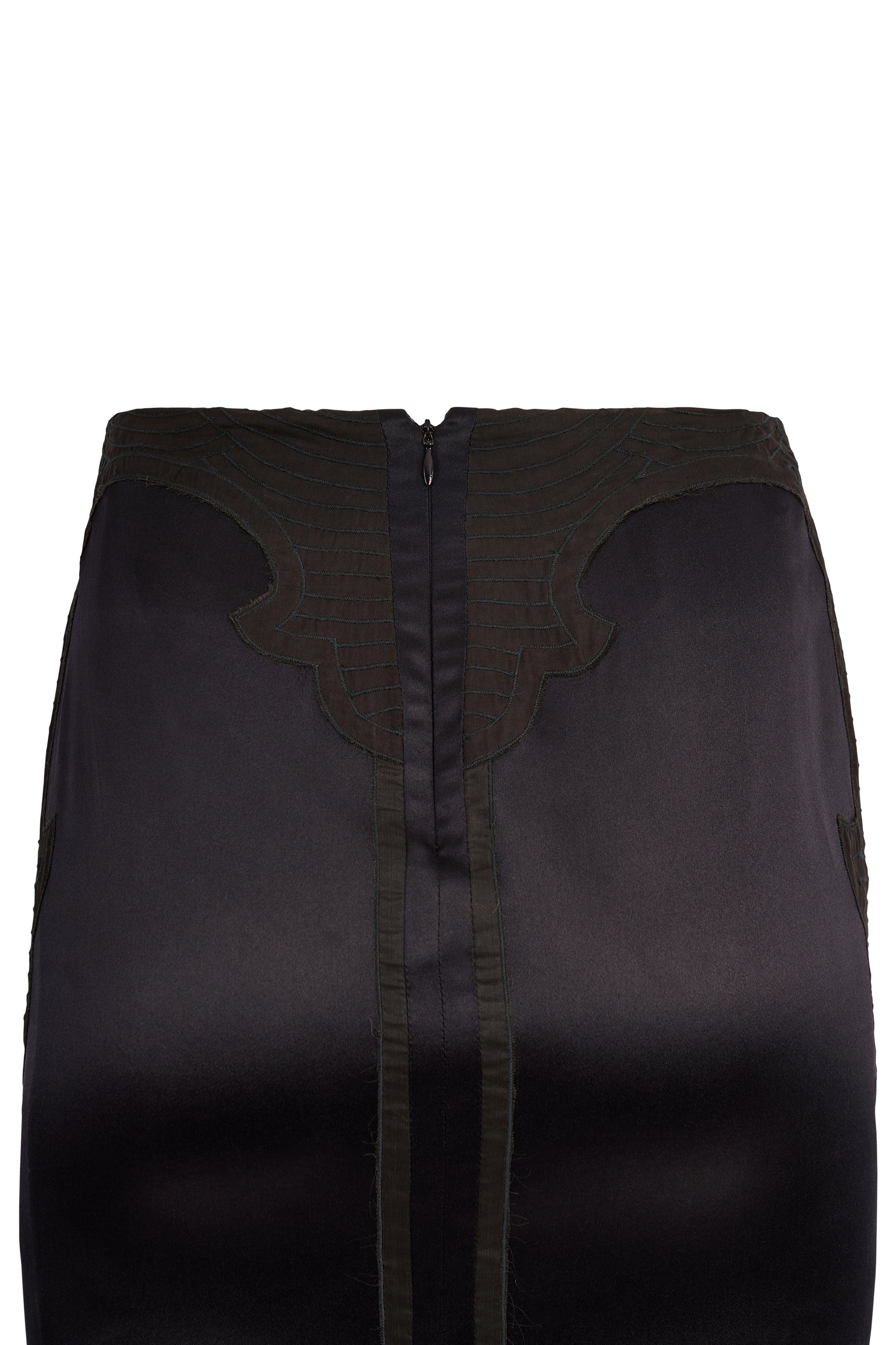 Vintage Yves Saint Laurent Rive Gauche by Tom Ford A/W 2004 " Le smoking" from the "Chinoiserie collection" black co ord set runway and campaign. The jacket features a cropped tailored fit with exaggerated shoulder line, satin shawl lapel jacquard pattern and single button closure. The skirt features a high waisted and straight column silhouette, side panel inserts, tonal jacquard matching the jacket, floor length two sleets on each side and fastens with a concealed back zip closure. In excellent vintage condition.