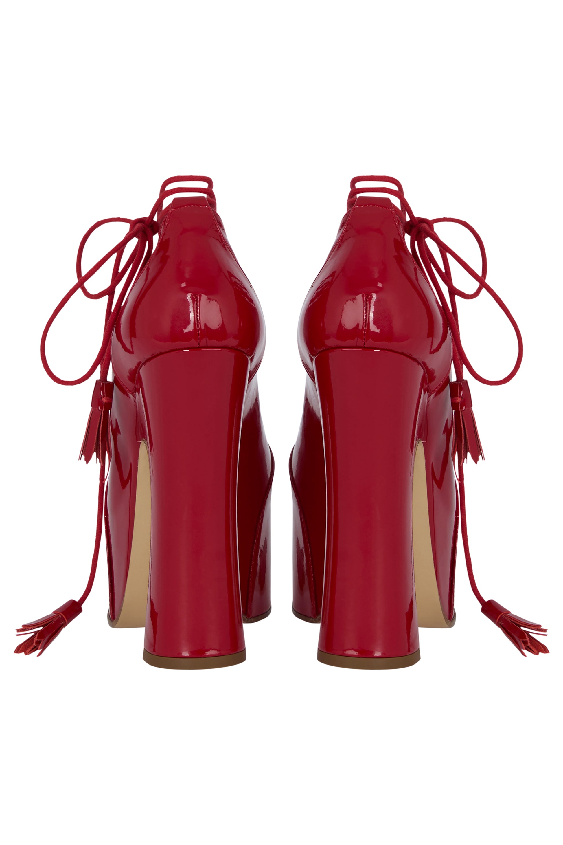 Vintage 2000's Vivienne Westwood Ghillie heels. Features a high shine red patent leather, dramatic lace-up ghillie construction that wraps the foot, set on a towering block heel with a substantial platform sole.