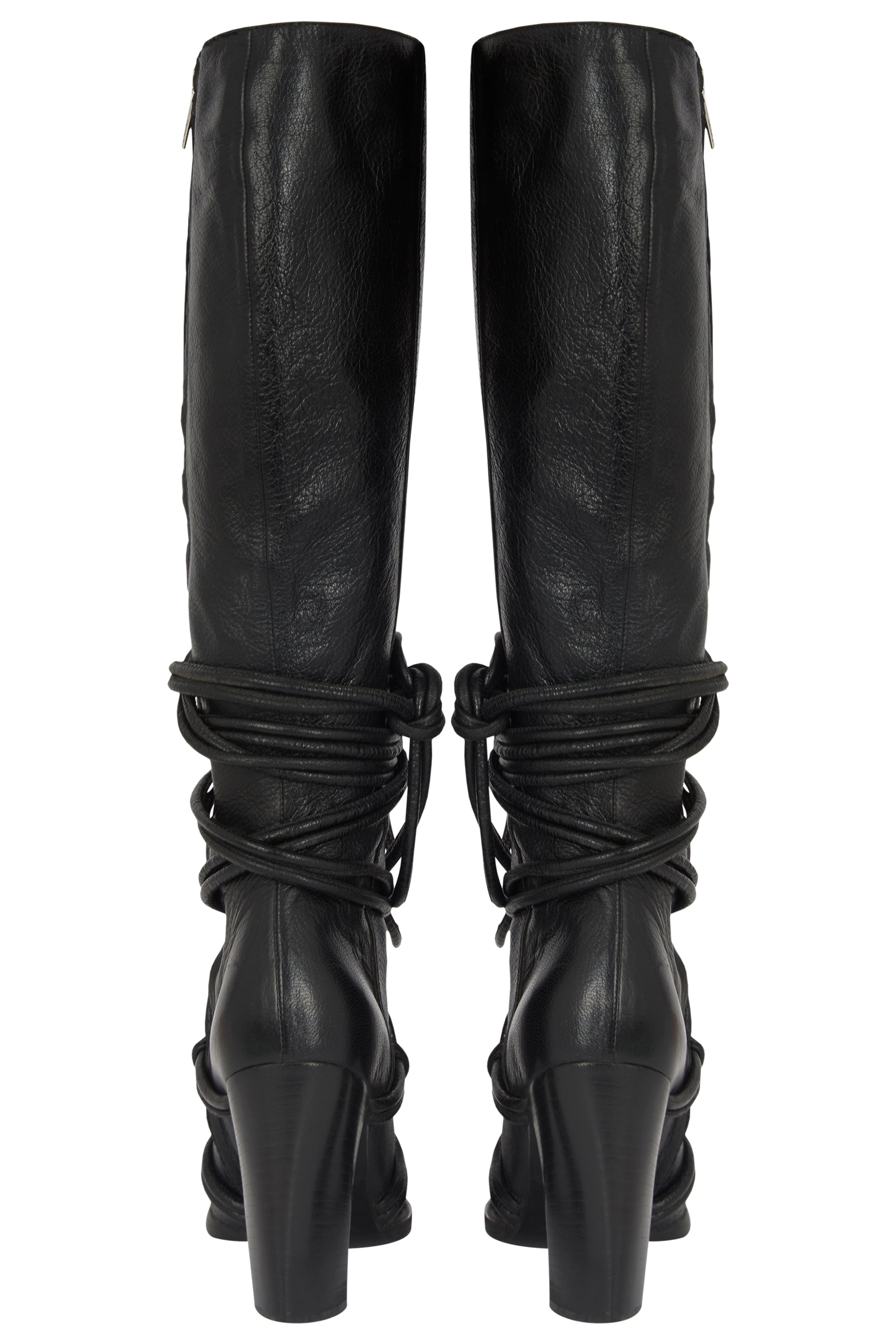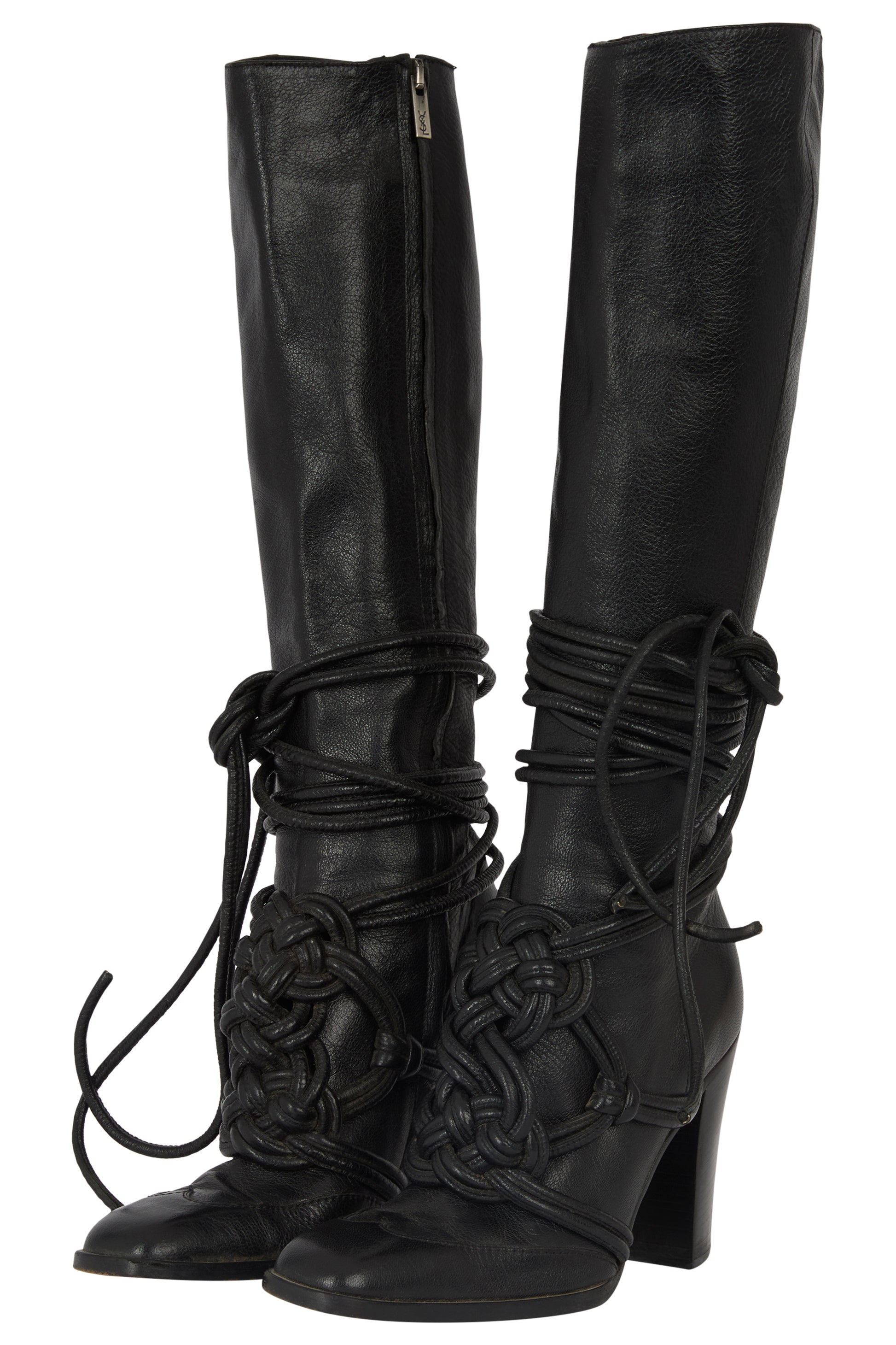 Vintage Yves Saint Laurent fall winter 2001 black lace boots. This rare piece from the 2001 fall winter collection designed by Tom Ford features a black leather body, an intricate rope lace construction and a knotted motif that wraps around the leg. Solid block heel and inner zip.