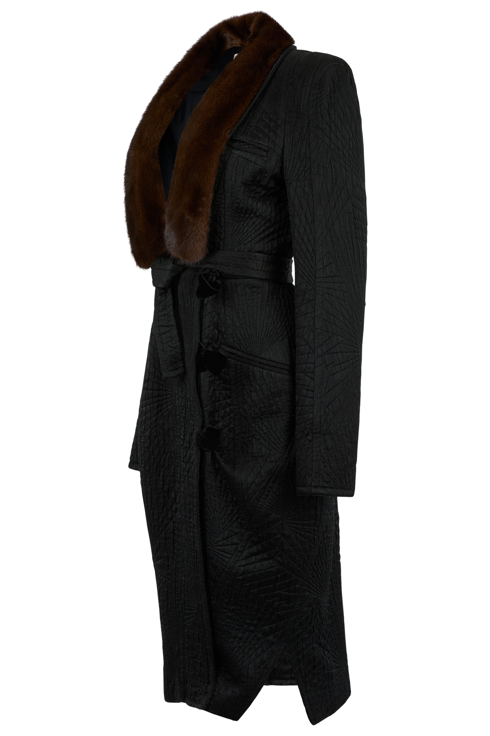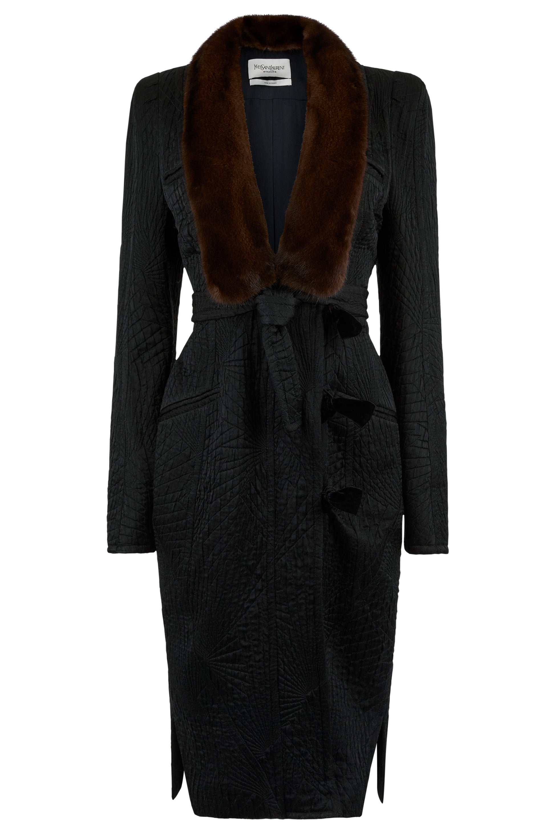 Vintage Yves Saint Laurent Fall/Winter 2004 collection, Features a structured longline fit, sculptural black jacquard with a subtle quilted texture, the design is finished with a sumptuous detachable brown fur collar. Tailored with a self-tie belt to define the waist and elegant velvet bow closures. In excellent vintage condition.