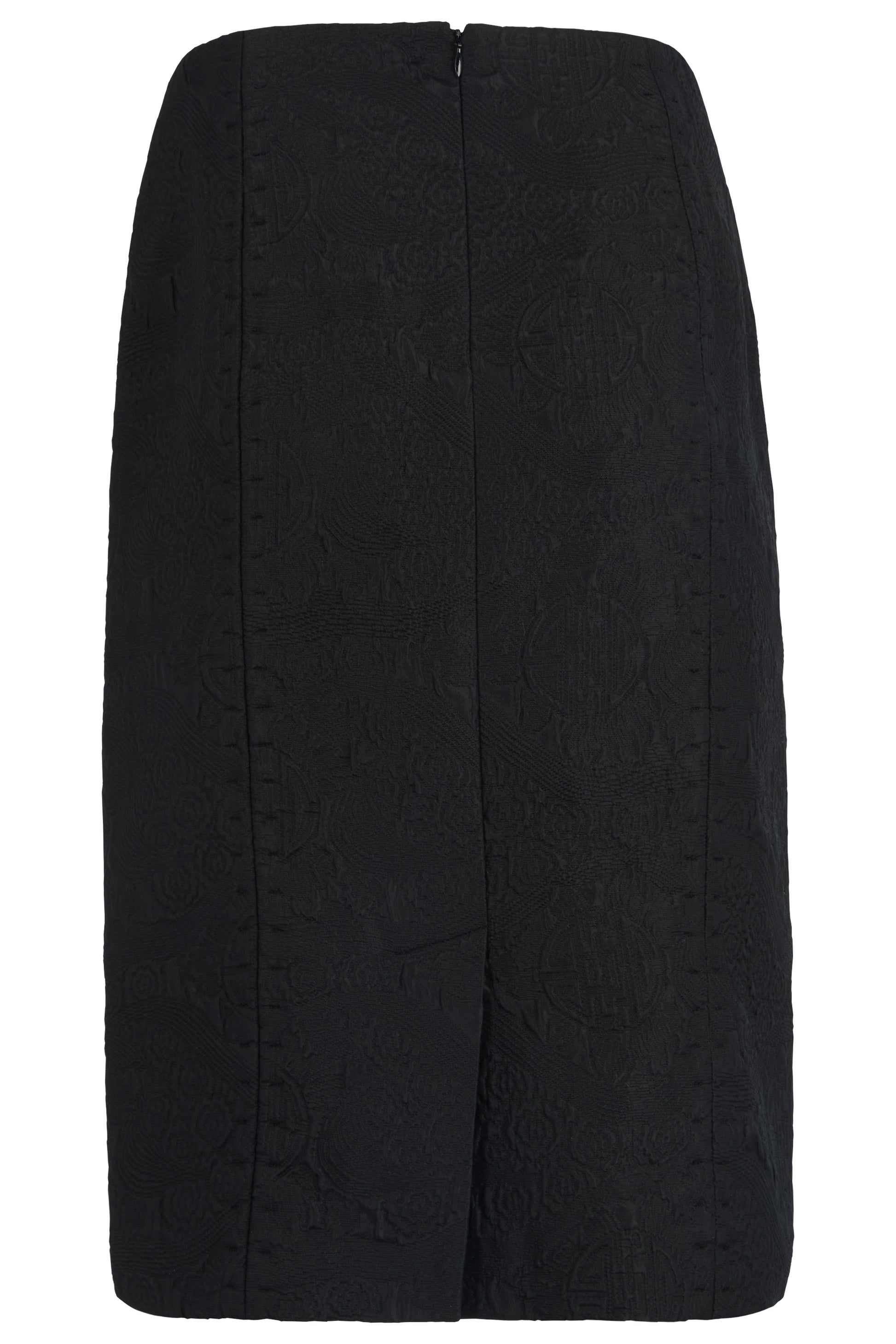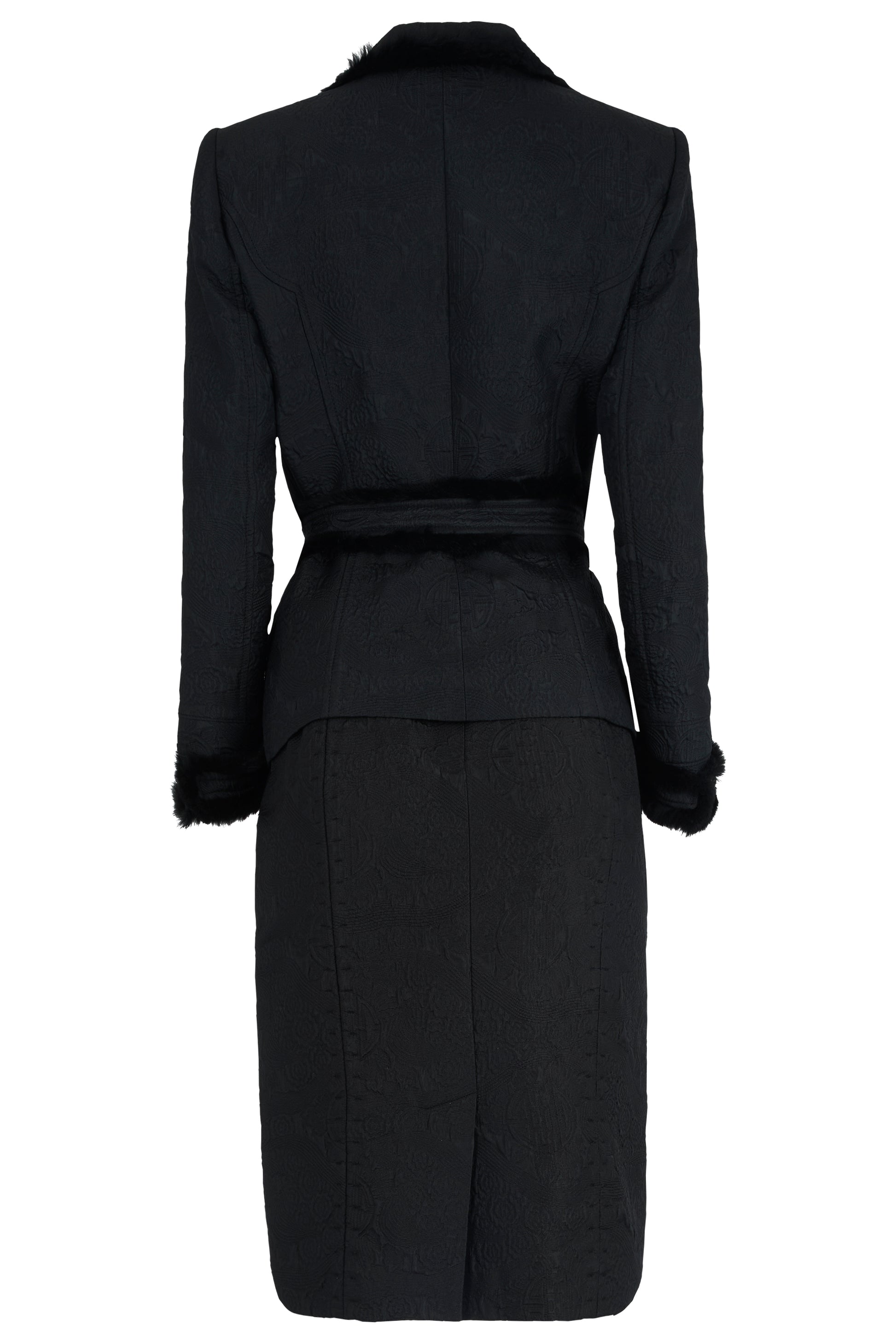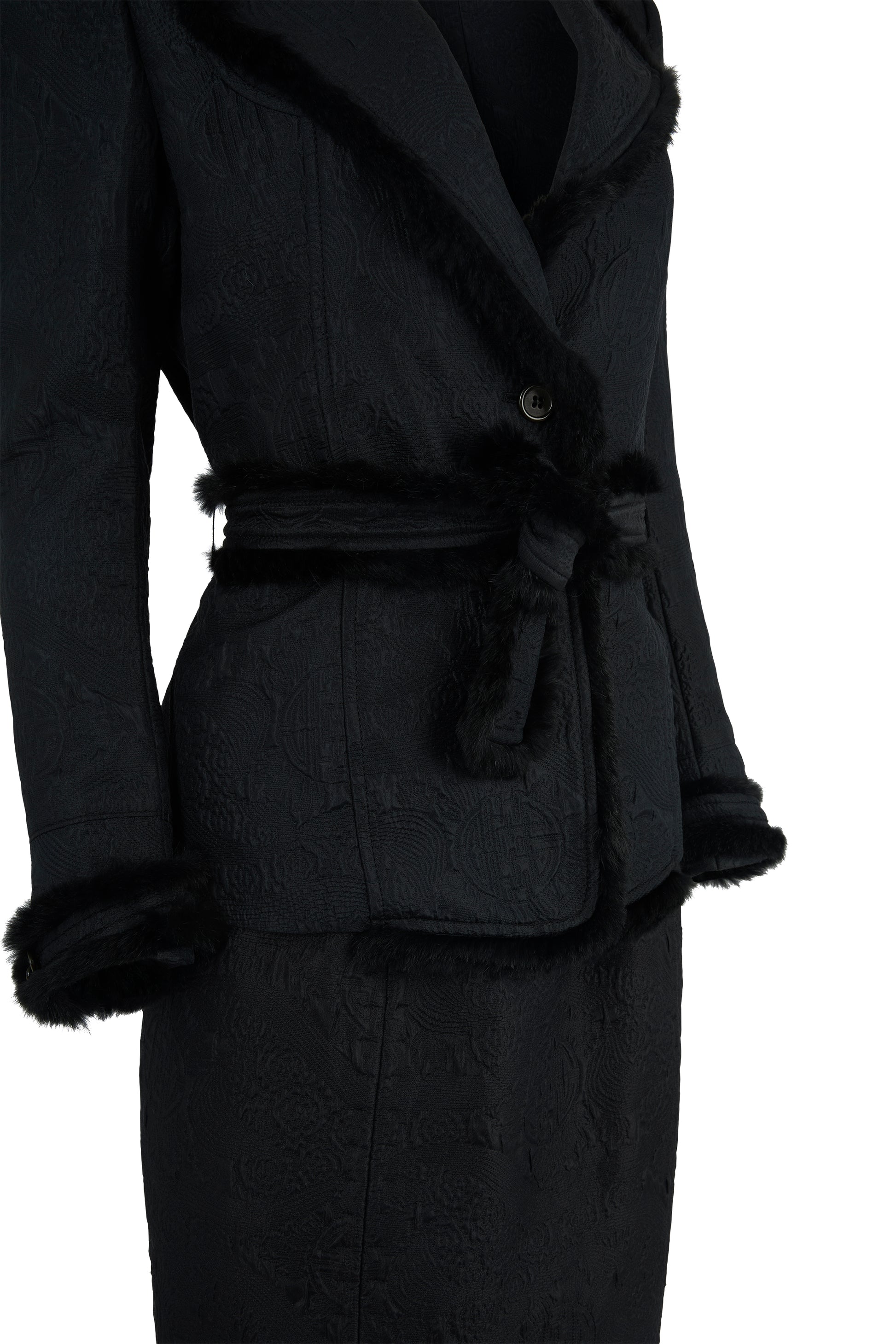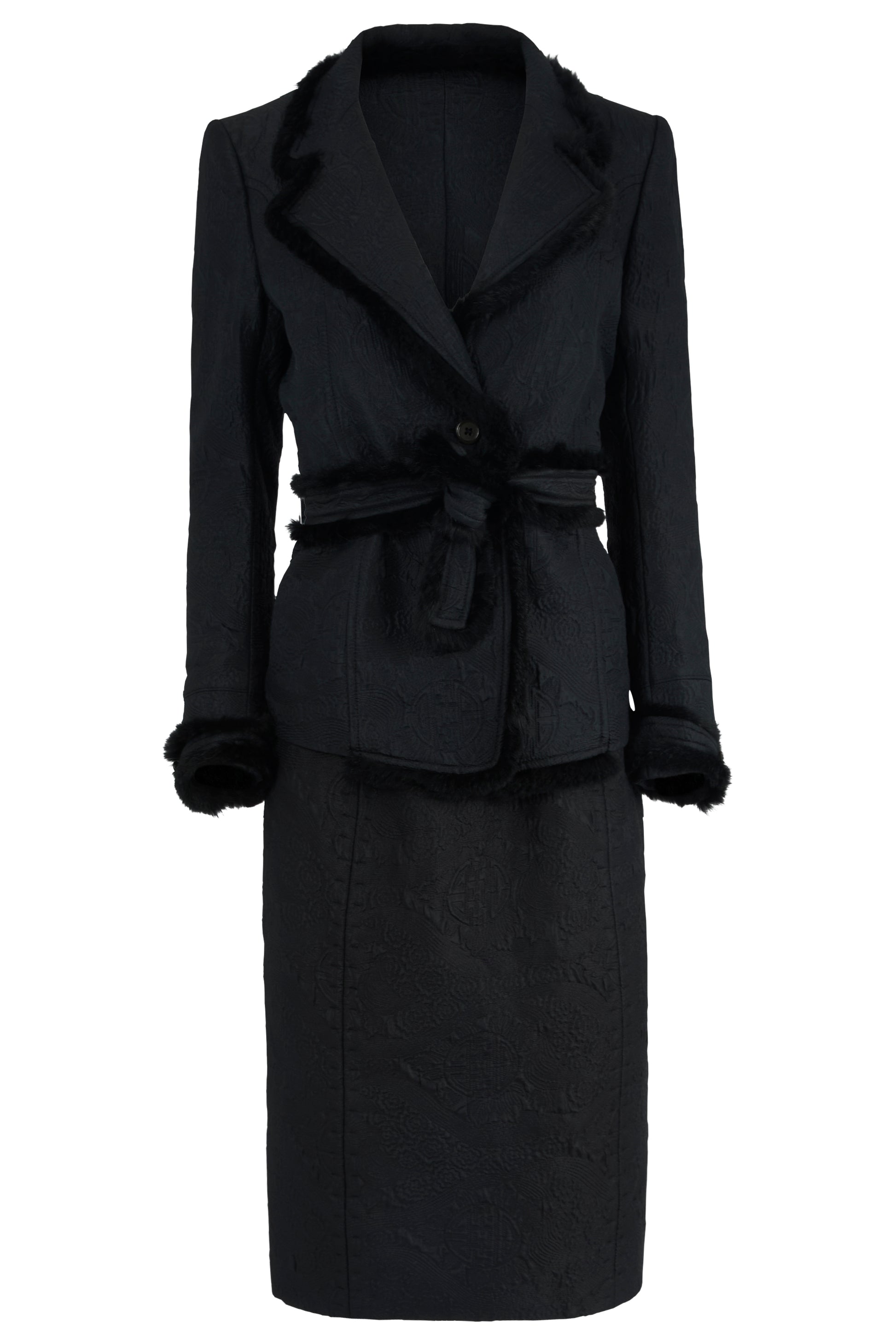 Vintage Yves Saint Laurent Fall Winter 2004 black mink fur trim co ord set. Crafted in black jacquard pattern, the silhouette is accentuated by plush mink trim along the lapels, cuffs, and hem. Cinched at the waist with a coordinating belt. Pencil skirt with a concealed back zip closure. The jacket fastens with one front button and belt.